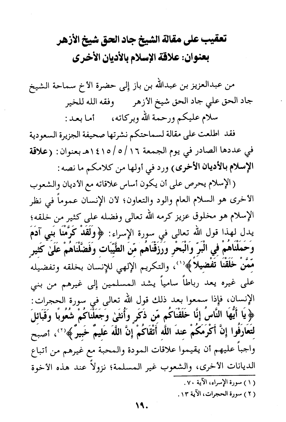فقد اطلعت على مقالة لسماحتكم نشرتها صحيفة الجزيرة السعودية في عددها الصادر في يوم الجمعة 16 \ 5 \ 1415 هـ بعنوان: (علاقة الإسلام بالأديان الأخرى) ورد في أولها من كلامكم ما نصه: