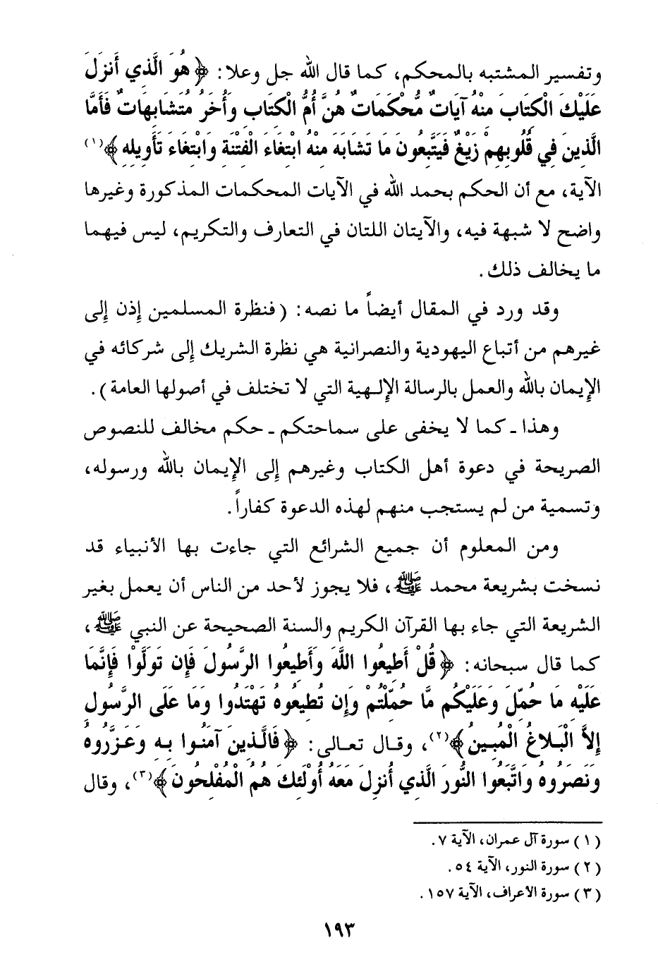 وقد ورد في المقال أيضا ما نصه: (فنظرة المسلمين إذن إلى غيرهم من أتباع اليهودية والنصرانية هي نظرة الشريك إلى شركائه في الإيمان بالله والعمل بالرسالة الإلهية التي لا تختلف في أصولها العامة) .