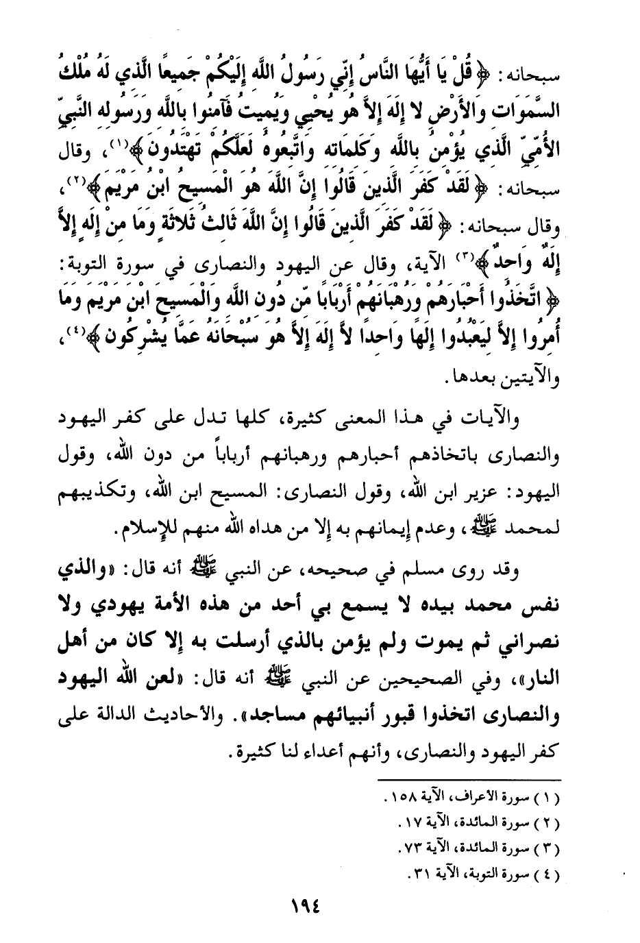 سبحانه: {قُلْ يَا أَيُّهَا النَّاسُ إِنِّي رَسُولُ اللَّهِ إِلَيْكُمْ جَمِيعًا الَّذِي لَهُ مُلْكُ السَّمَاوَاتِ وَالْأَرْضِ لَا إِلَهَ إِلَّا هُوَ يُحْيِي وَيُمِيتُ فَآمِنُوا بِاللَّهِ وَرَسُولِهِ النَّبِيِّ الْأُمِّيِّ الَّذِي يُؤْمِنُ بِاللَّهِ وَكَلِمَاتِهِ وَاتَّبِعُوهُ لَعَلَّكُمْ تَهْتَدُونَ} (¬1) وقال سبحانه: {لَقَدْ كَفَرَ الَّذِينَ قَالُوا إِنَّ اللَّهَ هُوَ الْمَسِيحُ ابْنُ مَرْيَمَ} (¬2) وقال سبحانه: {لَقَدْ كَفَرَ الَّذِينَ قَالُوا إِنَّ اللَّهَ ثَالِثُ ثَلَاثَةٍ وَمَا مِنْ إِلَهٍ إِلَّا إِلَهٌ وَاحِدٌ} (¬3) الآية، وقال عن اليهود والنصارى في سورة التوبة: {اتَّخَذُوا أَحْبَارَهُمْ وَرُهْبَانَهُمْ أَرْبَابًا مِنْ دُونِ اللَّهِ وَالْمَسِيحَ ابْنَ مَرْيَمَ وَمَا أُمِرُوا إِلَّا لِيَعْبُدُوا إِلَهًا وَاحِدًا لَا إِلَهَ إِلَّا هُوَ سُبْحَانَهُ عَمَّا يُشْرِكُونَ} (¬4) والآيتين بعدها.