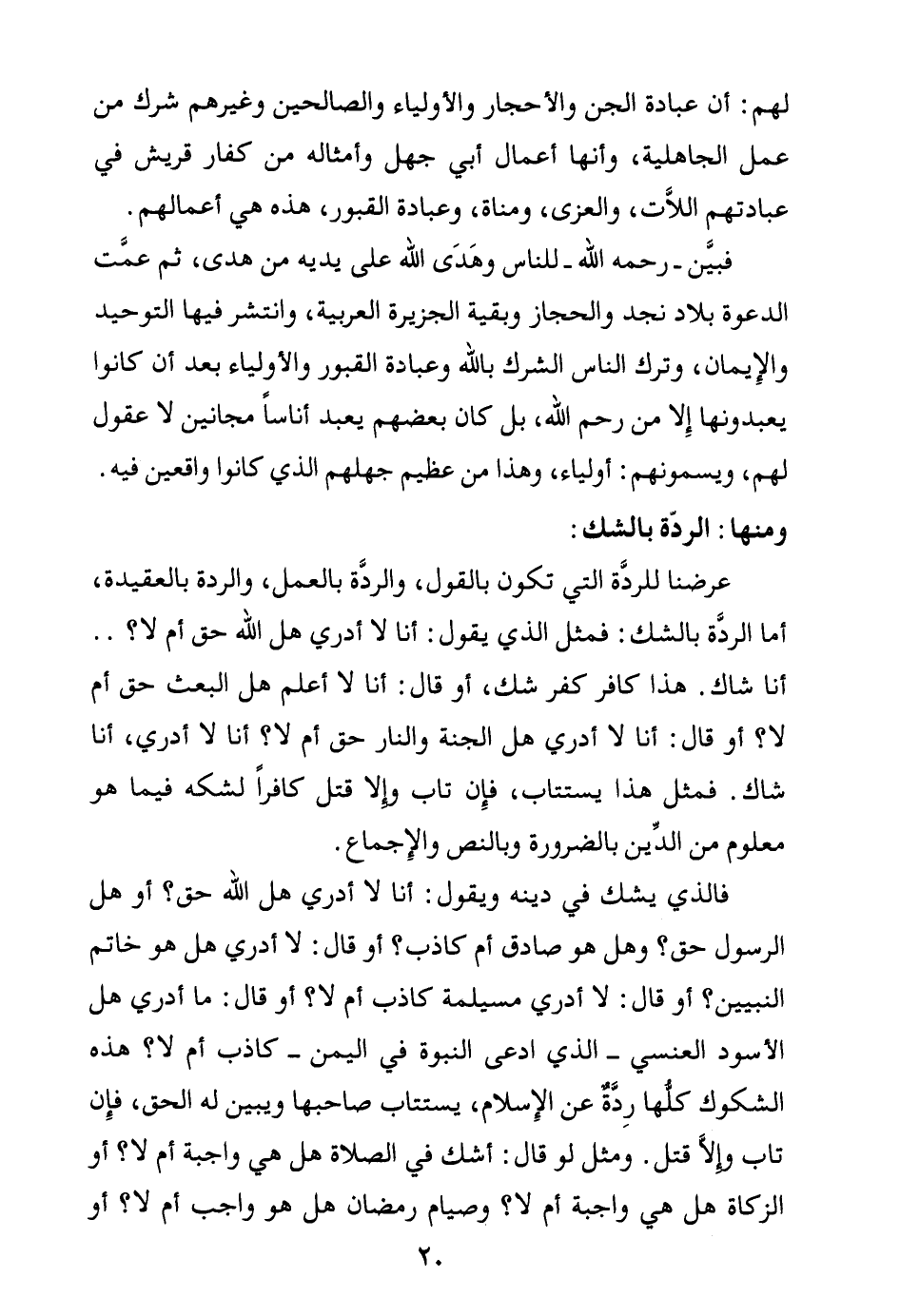 فالذي يشك في دينه ويقول: أنا لا أدري هل الله حق؟ أو هل الرسول حق؟ وهل هو صادق أم كاذب؟ أو قال: لا أدري هل هو خاتم النبيين؟ أو قال: لا أدري مسيلمة كاذب أم لا؟ أو قال: ما أدري هل الأسود العنسي - الذي ادعى النبوة في اليمن - كاذب أم لا؟ هذه الشكوك كلها ردة عن الإسلام، يستتاب صاحبها ويبين له الحق، فإن تاب وإلا قتل. ومثل لو قال: أشك في الصلاة هل هي واجبة أم لا؟ أو الزكاة هل هي واجبة أم لا؟ وصيام رمضان هل هو واجب أم لا؟ أو