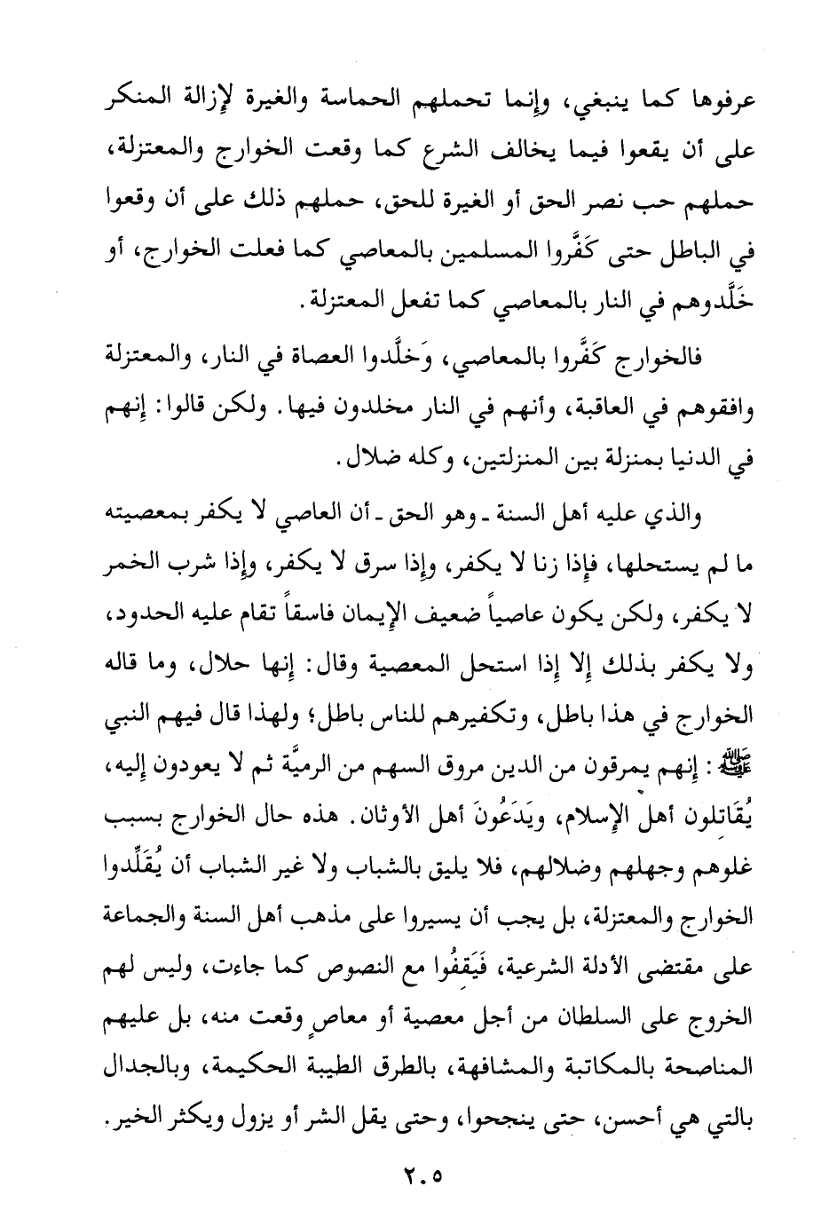والذي عليه أهل السنة - وهو الحق - أن العاصي لا يكفر بمعصيته ما لم يستحلها، فإذا زنا لا يكفر، وإذا سرق لا يكفر، وإذا شرب الخمر لا يكفر، ولكن يكون عاصيا ضعيف الإيمان فاسقا تقام عليه الحدود، ولا يكفر بذلك إلا إذا استحل المعصية وقال: إنها حلال، وما قاله الخوارج في هذا باطل، وتكفيرهم للناس باطل؛ ولهذا قال فيهم النبي صلى الله عليه وسلم: «إنهم يمرقون من الدين مروق السهم من الرمية ثم لا يعودون إليه، يقاتلون أهل الإسلام، ويدعون أهل الأوثان (¬1) » . هذه حال الخوارج بسبب غلوهم وجهلهم وضلالهم، فلا يليق بالشباب ولا غير الشباب أن يقلدوا الخوارج والمعتزلة، بل يجب أن يسيروا على مذهب أهل السنة والجماعة على مقتضى الأدلة الشرعية، فيقفوا مع النصوص كما جاءت، وليس لهم الخروج على السلطان من أجل معصية أو معاص وقعت منه، بل عليهم المناصحة بالمكاتبة والمشافهة، بالطرق الطيبة الحكيمة، وبالجدال بالتي هي أحسن، حتى ينجحوا، وحتى يقل الشر أو يزول ويكثر الخير.