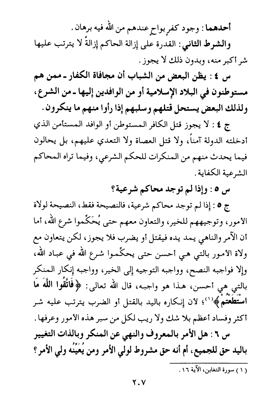 ج5: إذا لم توجد محاكم شرعية، فالنصيحة فقط، النصيحة لولاة الأمور، وتوجيههم للخير، والتعاون معهم حتى يحكموا شرع الله، أما أن الآمر والناهي يمد يده فيقتل أو يضرب فلا يجوز، لكن يتعاون مع ولاة الأمور بالتي هي أحسن حتى يحكموا شرع الله في عباد الله، وإلا فواجبه النصح، وواجبه التوجيه إلى الخير، وواجبه إنكار المنكر بالتي هي أحسن، هذا هو واجبه، قال الله تعالى: {فَاتَّقُوا اللَّهَ مَا اسْتَطَعْتُمْ} (¬1) لأن إنكاره باليد بالقتل أو الضرب يترتب عليه شر أكثر وفساد أعظم بلا شك ولا ريب لكل من سبر هذه الأمور وعرفها..