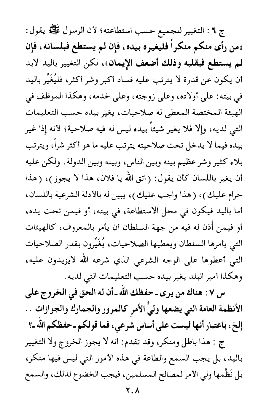 ج7: هذا باطل ومنكر، وقد تقدم: أنه لا يجوز الخروج ولا التغيير باليد، بل يجب السمع والطاعة في هذه الأمور التي ليس فيها منكر، بل نظمها ولي الأمر لمصالح المسلمين، فيجب الخضوع لذلك، والسمع