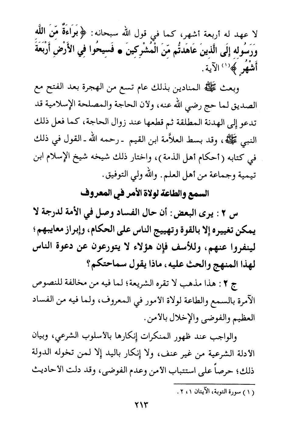 وبعث صلى الله عليه وسلم المنادين بذلك عام تسع من الهجرة بعد الفتح مع الصديق لما حج رضي الله عنه، ولأن الحاجة والمصلحة الإسلامية قد تدعو إلى الهدنة المطلقة ثم قطعها عند زوال الحاجة، كما فعل ذلك النبي صلى الله عليه وسلم، وقد بسط العلامة ابن القيم - رحمه الله - القول في ذلك في كتابه (أحكام أهل الذمة) ، واختار ذلك شيخه شيخ الإسلام ابن تيمية وجماعة من أهل العلم. والله ولي التوفيق.