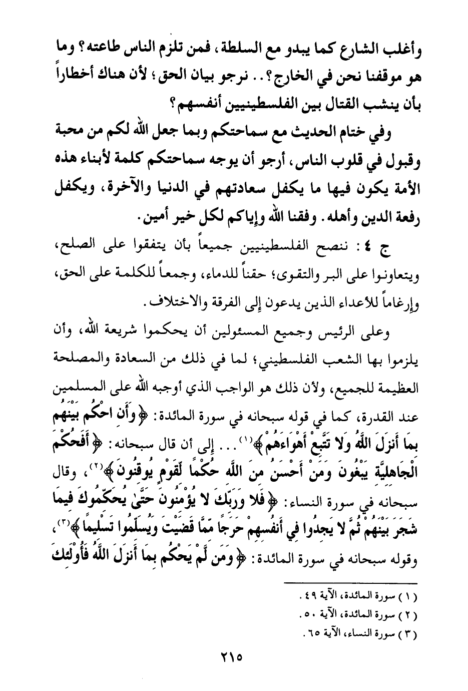 وعلى الرئيس وجميع المسئولين أن يحكموا شريعة الله، وأن يلزموا بها الشعب الفلسطيني؛ لما في ذلك من السعادة والمصلحة العظيمة للجميع، ولأن ذلك هو الواجب الذي أوجبه الله على المسلمين عند القدرة، كما في قوله سبحانه في سورة المائدة: {وَأَنِ احْكُمْ بَيْنَهُمْ بِمَا أَنْزَلَ اللَّهُ وَلَا تَتَّبِعْ أَهْوَاءَهُمْ} (¬1) إلى أن قال سبحانه: {أَفَحُكْمَ الْجَاهِلِيَّةِ يَبْغُونَ وَمَنْ أَحْسَنُ مِنَ اللَّهِ حُكْمًا لِقَوْمٍ يُوقِنُونَ} (¬2) وقال سبحانه في سورة النساء: {فَلَا وَرَبِّكَ لَا يُؤْمِنُونَ حَتَّى يُحَكِّمُوكَ فِيمَا شَجَرَ بَيْنَهُمْ ثُمَّ لَا يَجِدُوا فِي أَنْفُسِهِمْ حَرَجًا مِمَّا قَضَيْتَ وَيُسَلِّمُوا تَسْلِيمًا} (¬3) وقوله سبحانه في سورة المائدة: {وَمَنْ لَمْ يَحْكُمْ بِمَا أَنْزَلَ اللَّهُ فَأُولَئِكَ هُمُ الْكَافِرُونَ} (¬4)