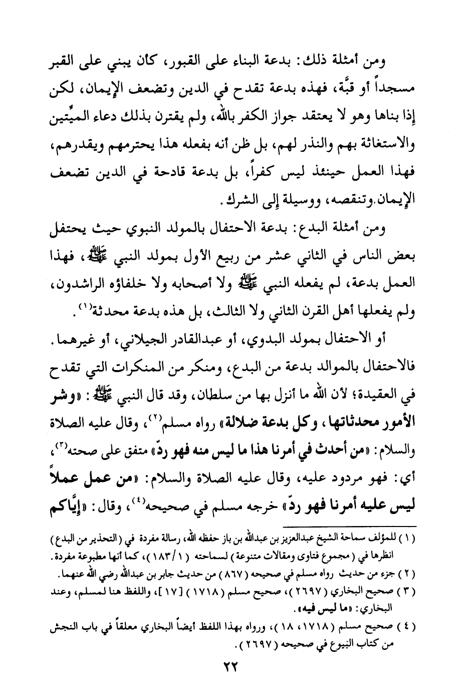 أو الاحتفال بمولد البدوي، أو عبد القادر الجيلاني، أو غيرهما، فالاحتفال بالموالد بدعة من البدع، ومنكر من المنكرات التي تقدح في العقيدة؛ لأن الله ما أنزل بها من سلطان، وقد قال النبي صلى الله عليه وسلم: «وشر الأمور محدثاتها وكل بدعة ضلالة» رواه مسلم (¬1) ، وقال عليه الصلاة والسلام: «من أحدث في أمرنا هذا ما ليس منه فهو رد» متفق على صحته (¬2) ، أي: فهو مردود عليه، وقال عليه الصلاة والسلام: «من عمل عملا ليس عليه أمرنا فهو رد» خرجه مسلم في صحيحه، وقال: «إياكم