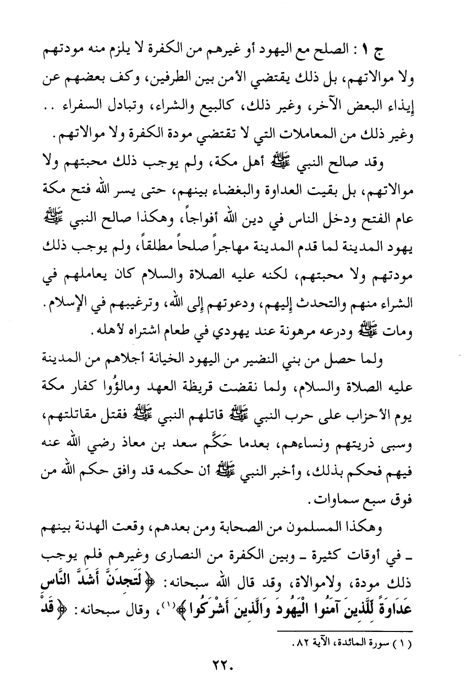 وهكذا المسلمون من الصحابة ومن بعدهم، وقعت الهدنة بينهم - في أوقات كثيرة - وبين الكفرة من النصارى وغيرهم فلم يوجب ذلك مودة، ولا موالاة، وقد قال الله سبحانه: {لَتَجِدَنَّ أَشَدَّ النَّاسِ عَدَاوَةً لِلَّذِينَ آمَنُوا الْيَهُودَ وَالَّذِينَ أَشْرَكُوا} (¬1)