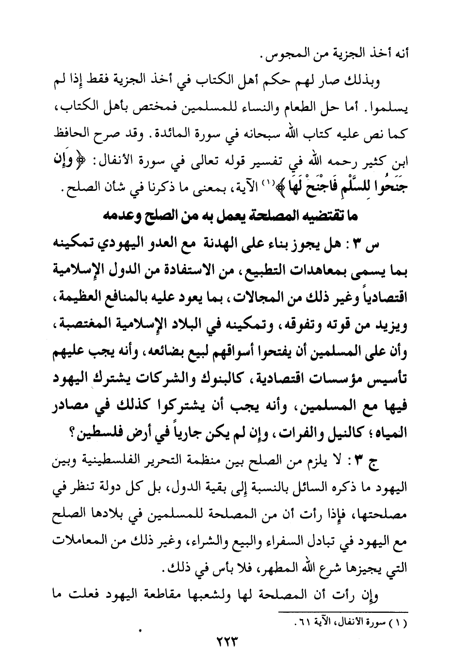 ج3: لا يلزم من الصلح بين منظمة التحرير الفلسطينية وبين اليهود ما ذكره السائل بالنسبة إلى بقية الدول، بل كل دولة تنظر في مصلحتها، فإذا رأت أن من المصلحة للمسلمين في بلادها الصلح مع اليهود في تبادل السفراء والبيع والشراء، وغير ذلك من المعاملات التي يجيزها شرع الله المطهر، فلا بأس في ذلك.