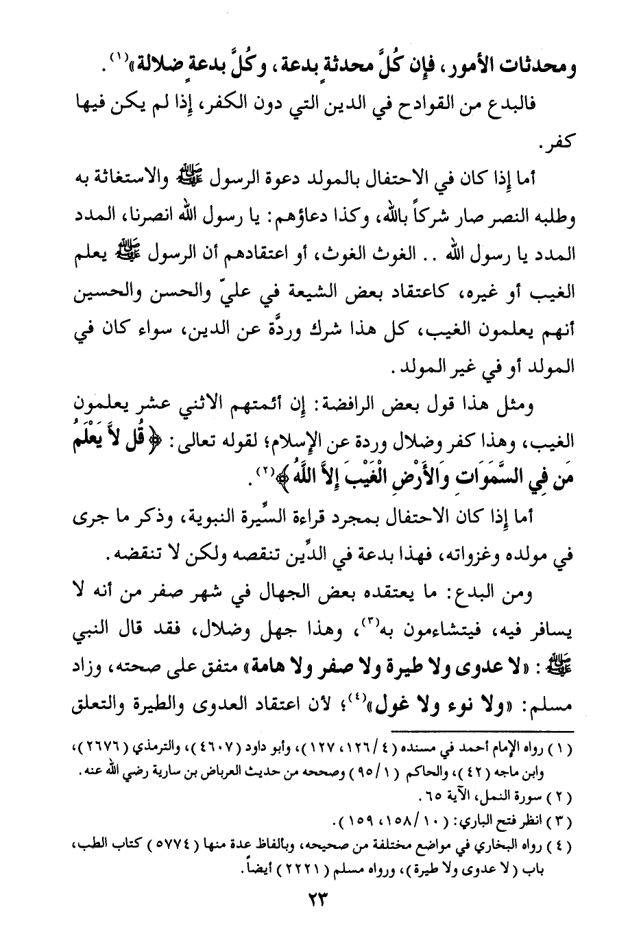 ومن البدع: ما يعتقده بعض الجهال في شهر صفر من أنه لا يسافر فيه، فيتشاءمون به (¬3) ، وهذا جهل وضلال، فقد قال النبي صلى الله عليه وسلم: «لا عدوى ولا طيرة ولا صفر ولا هامة (¬4) » متفق على صحته، وزاد مسلم: «ولا نوء ولا غول (¬5) » ؛ لأن اعتقاد العدوى والطيرة والتعلق