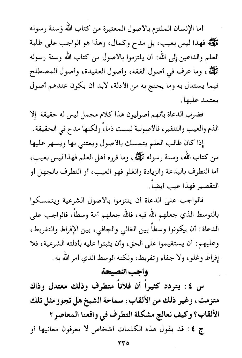 فالواجب على الدعاة أن يلتزموا بالأصول الشرعية ويتمسكوا بالتوسط الذي جعلهم الله فيه، فالله جعلهم أمة وسطا، فالواجب على الدعاة: أن يكونوا وسطا بين الغالي والجافي، بين الإفراط والتفريط، وعليهم: أن يستقيموا على الحق، وأن يثبتوا عليه بأدلته الشرعية، فلا إفراط وغلو، ولا جفاء وتفريط، ولكنه الوسط الذي أمر الله به.