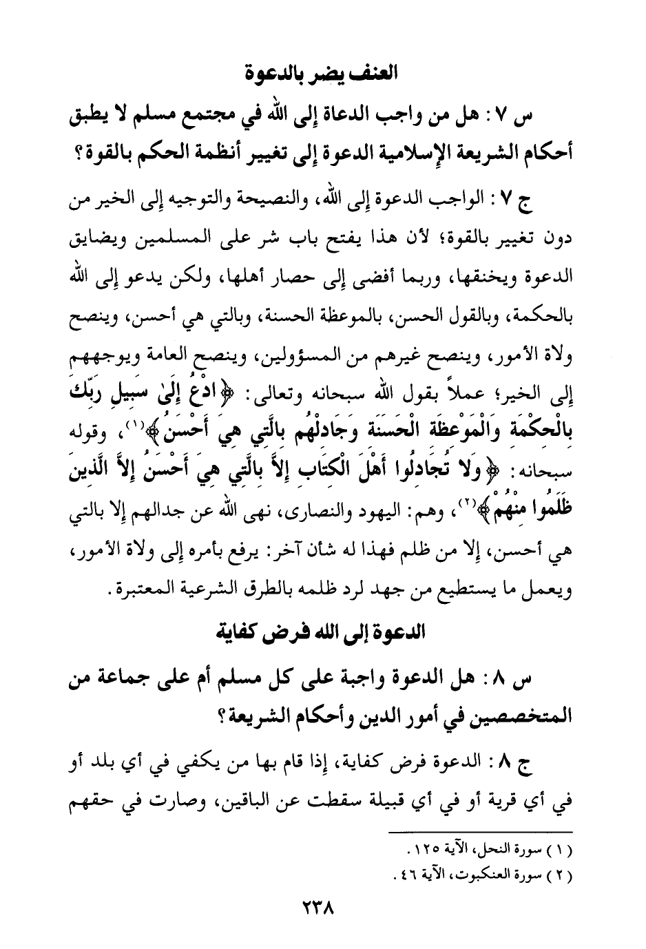 س7: هل من واجب الدعاة إلى الله في مجتمع مسلم لا يطبق أحكام الشريعة الإسلامية الدعوة إلى تغيير أنظمة الحكم بالقوة؟ .