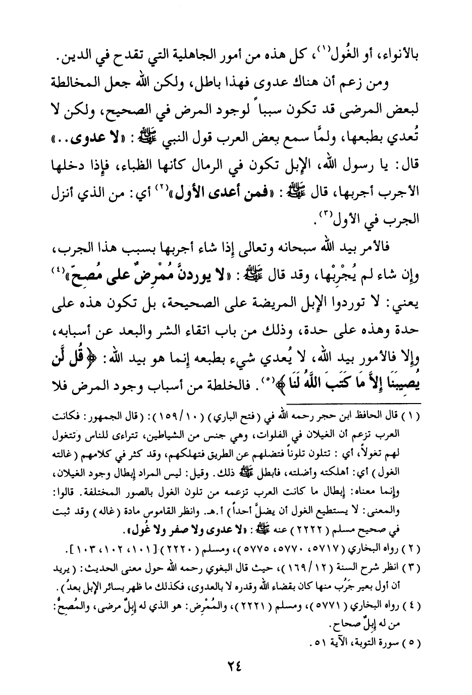 ومن زعم أن هناك عدوى فهذا باطل، ولكن الله جعل المخالطة لبعض المرضى قد تكون سببا لوجود المرض في الصحيح، ولكن لا تعدي بطبعها، ولما سمع بعض العرب قول النبي صلى الله عليه وسلم: «لا عدوى ... قال: يا رسول الله، الإبل تكون في الرمال كأنها الظباء، فإذا دخلها الأجرب أجربها؟ قال صلى الله عليه وسلم: فمن أعدى الأول؟ (¬1) » أي: من الذي أنزل الجرب في الأول؟ .