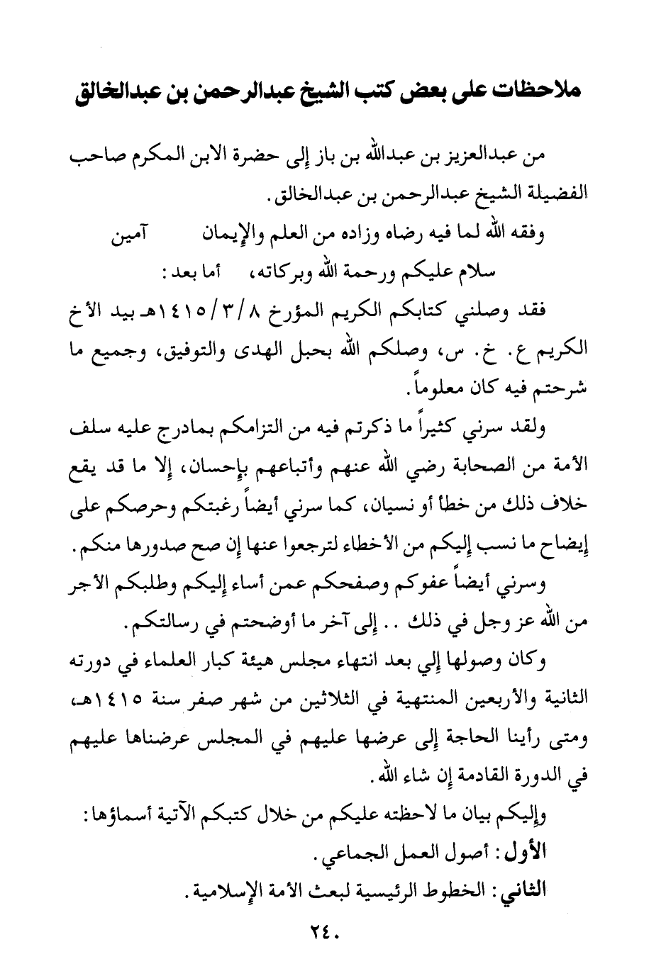 وإليكم بيان ما لاحظته عليكم من خلال كتبكم الآتية أسماؤها: الأول: أصول العمل الجماعي.