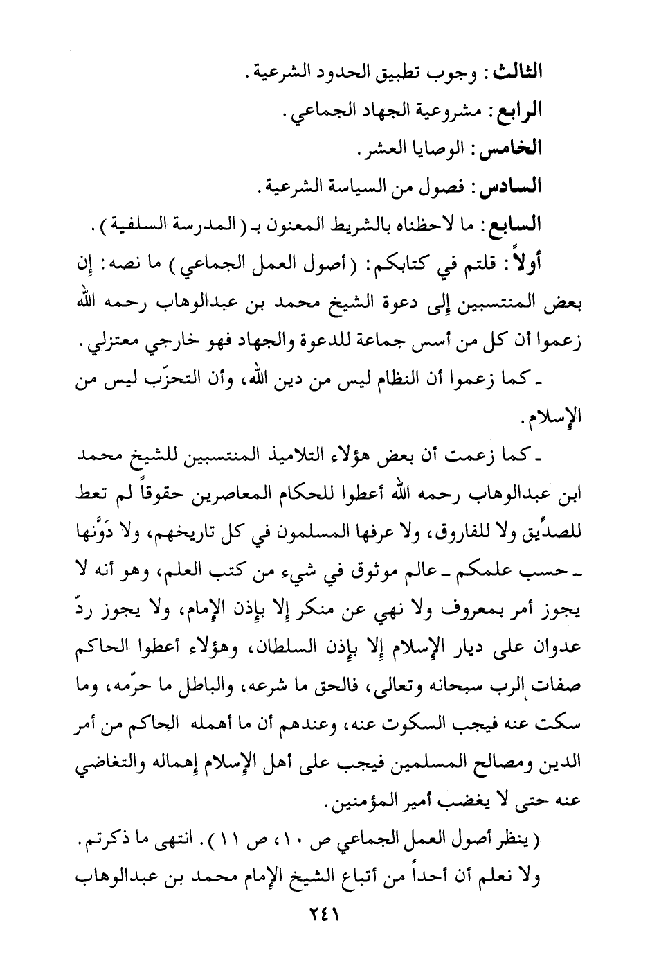 (ينظر أصول العمل الجماعي ص 10، ص 11) . انتهى ما ذكرتم. ولا نعلم أن أحدا من أتباع الشيخ الإمام محمد بن عبد الوهاب