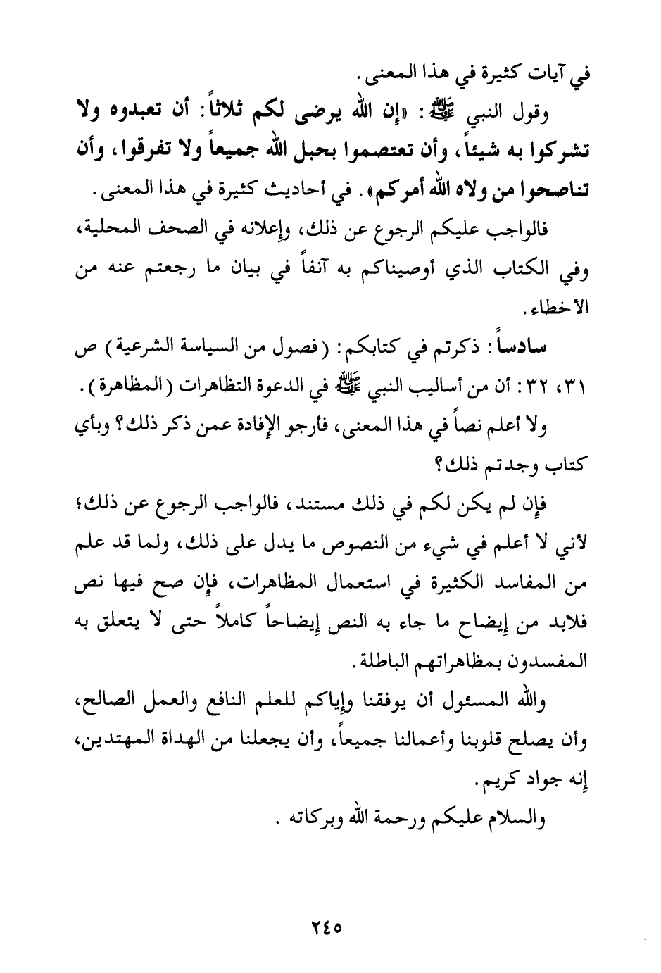 فإن لم يكن لكم في ذلك مستند، فالواجب الرجوع عن ذلك؛ لأني لا أعلم في شيء من النصوص ما يدل على ذلك، ولما قد علم من المفاسد الكثيرة في استعمال المظاهرات، فإن صح فيها نص فلا بد من إيضاح ما جاء به النص إيضاحا كاملا حتى لا يتعلق به المفسدون بمظاهراتهم الباطلة.