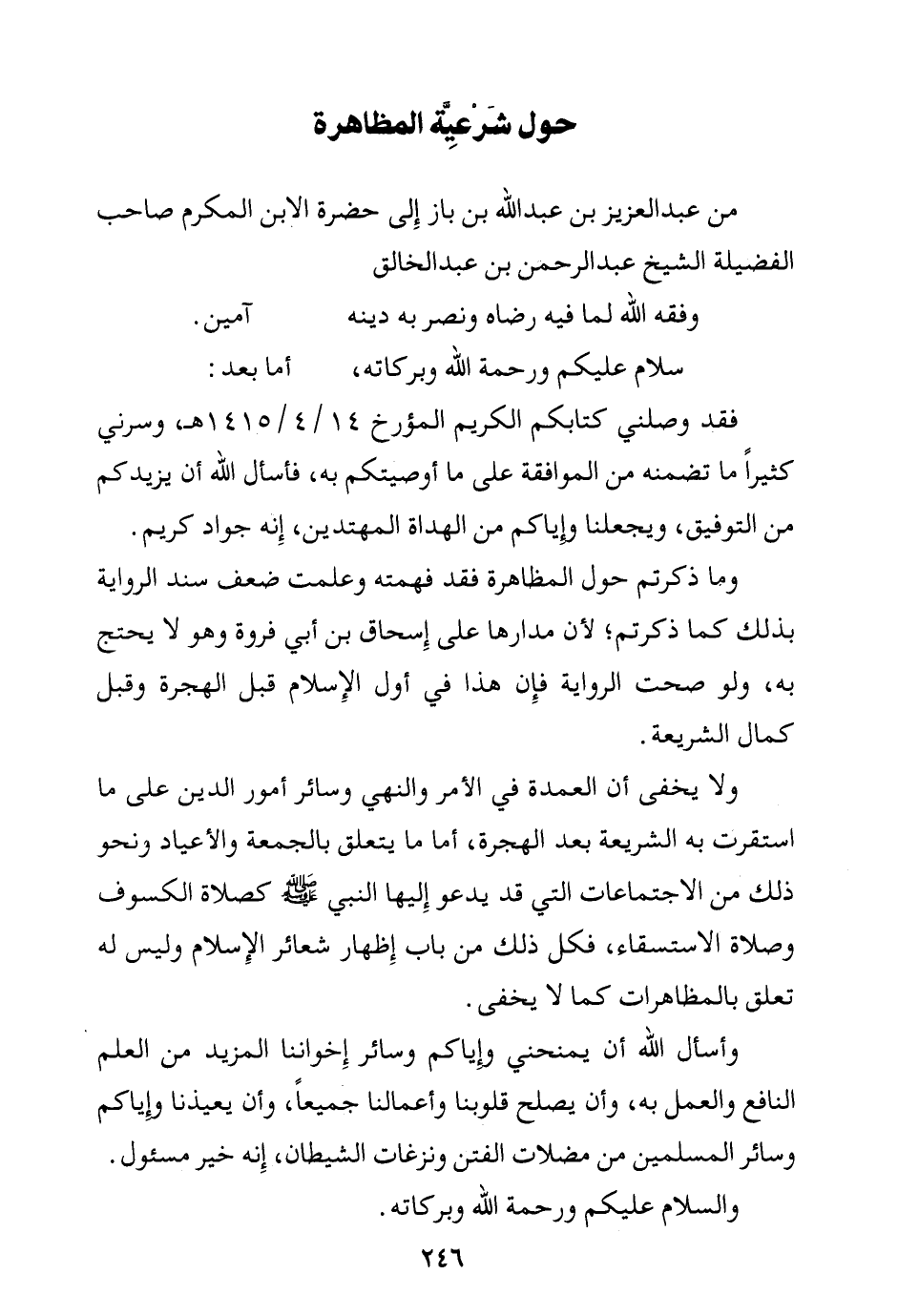 ولا يخفى أن العمدة في الأمر والنهي وسائر أمور الدين على ما استقرت به الشريعة بعد الهجرة، أما ما يتعلق بالجمعة والأعياد ونحو ذلك من الاجتماعات التي قد يدعو إليها النبي صلى الله عليه وسلم كصلاة الكسوف وصلاة الاستسقاء، فكل ذلك من باب إظهار شعائر الإسلام وليس له تعلق بالمظاهرات كما لا يخفى.