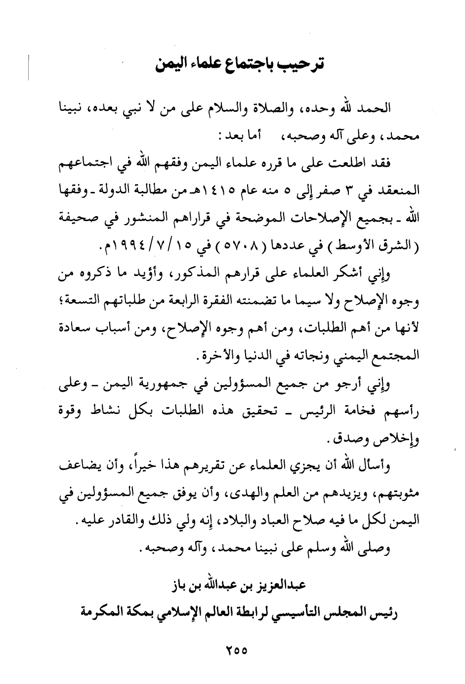فقد اطلعت على ما قرره علماء اليمن وفقهم الله في اجتماعهم المنعقد في 3 صفر إلى 5 منه عام 1415 هـ من مطالبة الدولة - وفقها الله - بجميع الإصلاحات الموضحة في قراراهم المنشور في صحيفة (الشرق الأوسط) في عددها (5708) في 15\7\1994 م.