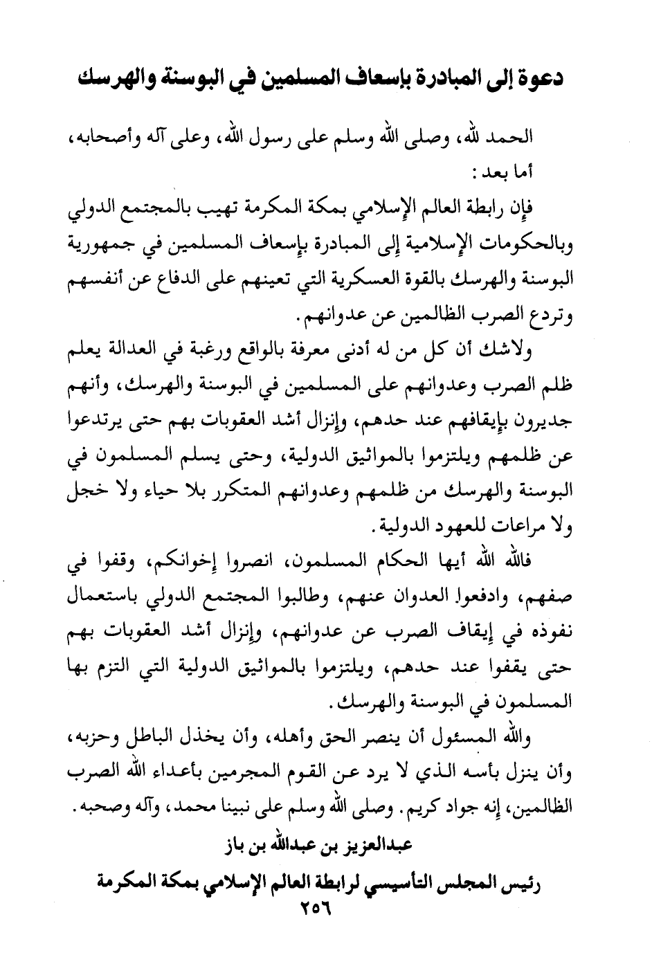 فالله الله أيها الحكام المسلمون، انصروا إخوانكم، وقفوا في صفهم، وادفعوا العدوان عنهم، وطالبوا المجتمع الدولي باستعمال نفوذه في إيقاف الصرب عن عدوانهم، وإنزال أشد العقوبات بهم حتى يقفوا عند حدهم، ويلتزموا بالمواثيق الدولية التي التزم بها المسلمون في البوسنة والهرسك.