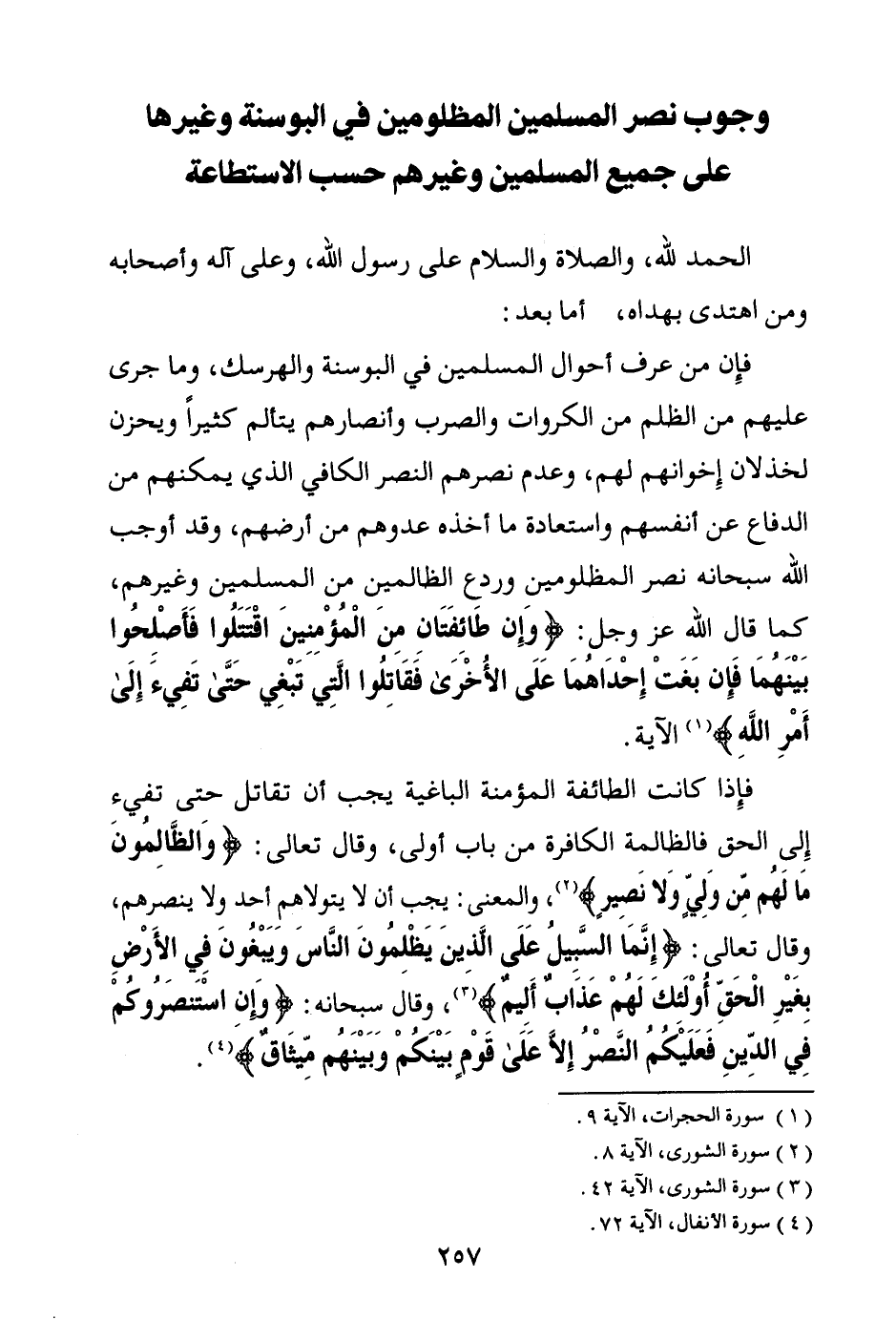 فإن من عرف أحوال المسلمين في البوسنة والهرسك، وما جرى عليهم من الظلم من الكروات والصرب وأنصارهم يتألم كثيرا ويحزن لخذلان إخوانهم لهم، وعدم نصرهم النصر الكافي الذي يمكنهم من الدفاع عن أنفسهم واستعادة ما أخذه عدوهم من أرضهم، وقد أوجب الله سبحانه نصر المظلومين وردع الظالمين من المسلمين وغيرهم، كما قال الله عز وجل: {وَإِنْ طَائِفَتَانِ مِنَ الْمُؤْمِنِينَ اقْتَتَلُوا فَأَصْلِحُوا بَيْنَهُمَا فَإِنْ بَغَتْ إِحْدَاهُمَا عَلَى الْأُخْرَى فَقَاتِلُوا الَّتِي تَبْغِي حَتَّى تَفِيءَ إِلَى أَمْرِ اللَّهِ} (¬1) الآية.