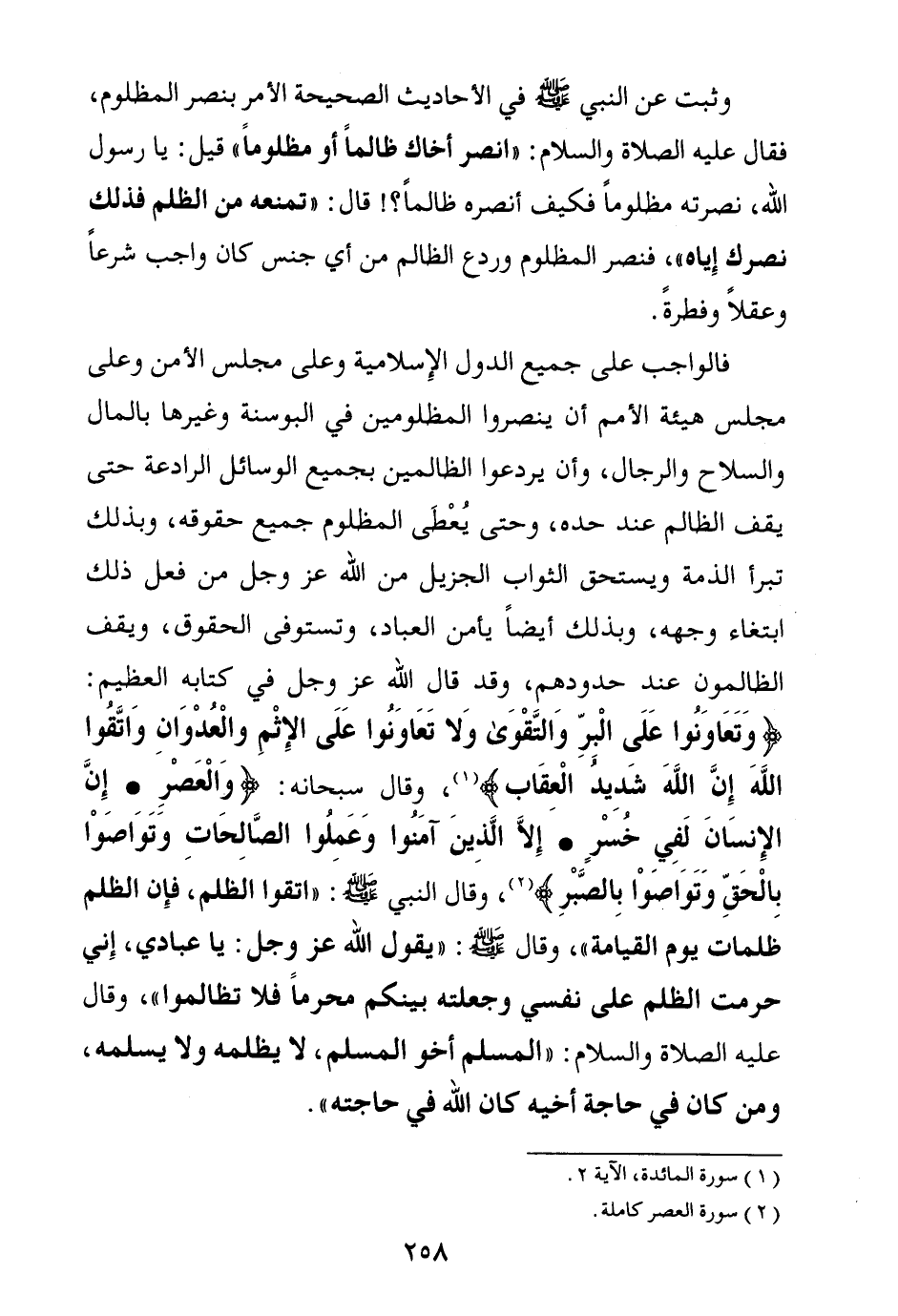وثبت عن النبي صلى الله عليه وسلم في الأحاديث الصحيحة الأمر بنصر المظلوم، فقال عليه الصلاة والسلام: «انصر أخاك ظالما أو مظلوما. قيل: يا رسول الله، نصرته مظلوما فكيف أنصره ظالما؟! قال: تمنعه من الظلم فذلك نصرك إياه (¬1) » ، فنصر المظلوم وردع الظالم من أي جنس كان واجب شرعا وعقلا وفطرة. فالواجب على جميع الدول الإسلامية وعلى مجلس الأمن وعلى مجلس هيئة الأمم أن ينصروا المظلومين في البوسنة وغيرها بالمال والسلاح والرجال، وأن يردعوا الظالمين بجميع الوسائل الرادعة حتى يقف الظالم عند حده، وحتى يعطى المظلوم جميع حقوقه، وبذلك تبرأ الذمة ويستحق الثواب الجزيل من الله عز وجل من فعل ذلك ابتغاء وجهه، وبذلك أيضا يأمن العباد، وتستوفى الحقوق، ويقف الظالمون عند حدودهم، وقد قال الله عز وجل في كتابه العظيم: {وَتَعَاوَنُوا عَلَى الْبِرِّ وَالتَّقْوَى وَلَا تَعَاوَنُوا عَلَى الْإِثْمِ وَالْعُدْوَانِ وَاتَّقُوا اللَّهَ إِنَّ اللَّهَ شَدِيدُ الْعِقَابِ} (¬2) وقال سبحانه: {وَالْعَصْرِ} (¬3) {إِنَّ الْإِنْسَانَ لَفِي خُسْرٍ} (¬4) {إِلَّا الَّذِينَ آمَنُوا وَعَمِلُوا الصَّالِحَاتِ وَتَوَاصَوْا بِالْحَقِّ وَتَوَاصَوْا بِالصَّبْرِ} (¬5) وقال النبي صلى الله عليه وسلم: «اتقوا الظلم فإن الظلم ظلمات يوم القيامة (¬6) » ، وقال صلى الله عليه وسلم: «يقول الله عز وجل: يا عبادي، إني حرمت الظلم على نفسي، وجعلته بينكم محرما، فلا تظالموا (¬7) » ، وقال عليه الصلاة والسلام: «المسلم أخو المسلم، لا يظلمه ولا يسلمه، ومن كان في حاجة أخيه كان الله في حاجته (¬8) » .