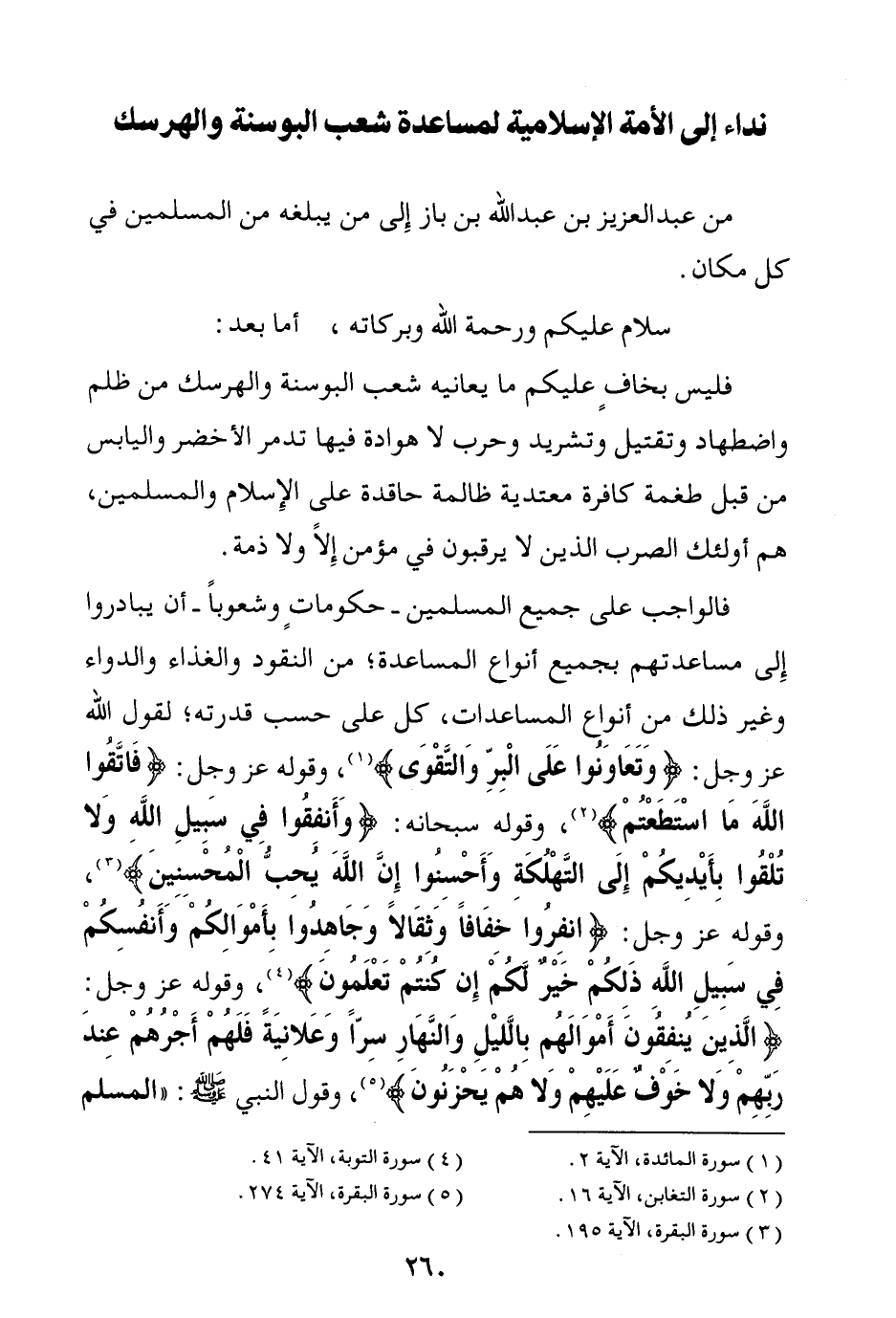 فليس بخاف عليكم ما يعانيه شعب البوسنة والهرسك من ظلم واضطهاد، وتقتيل وتشريد وحرب لا هوادة فيها، تدمر الأخضر واليابس من قبل طغمة كافرة معتدية ظالمة حاقدة على الإسلام والمسلمين، هم أولئك الصرب الذين لا يرقبون في مؤمن إلا ولا ذمة.