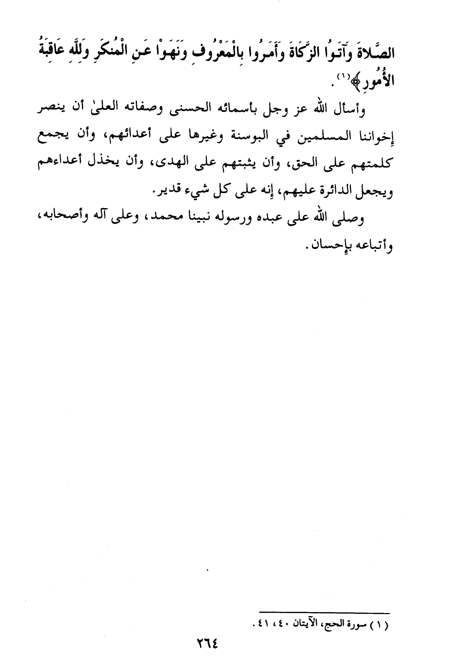 وأسأل الله عز وجل بأسمائه الحسنى وصفاته العلى أن ينصر إخواننا المسلمين في البوسنة وغيرها على أعدائهم، وأن يجمع كلمتهم على الحق، وأن يثبتهم على الهدى، وأن يخذل أعداءهم ويجعل الدائرة عليهم، إنه على كل شيء قدير.