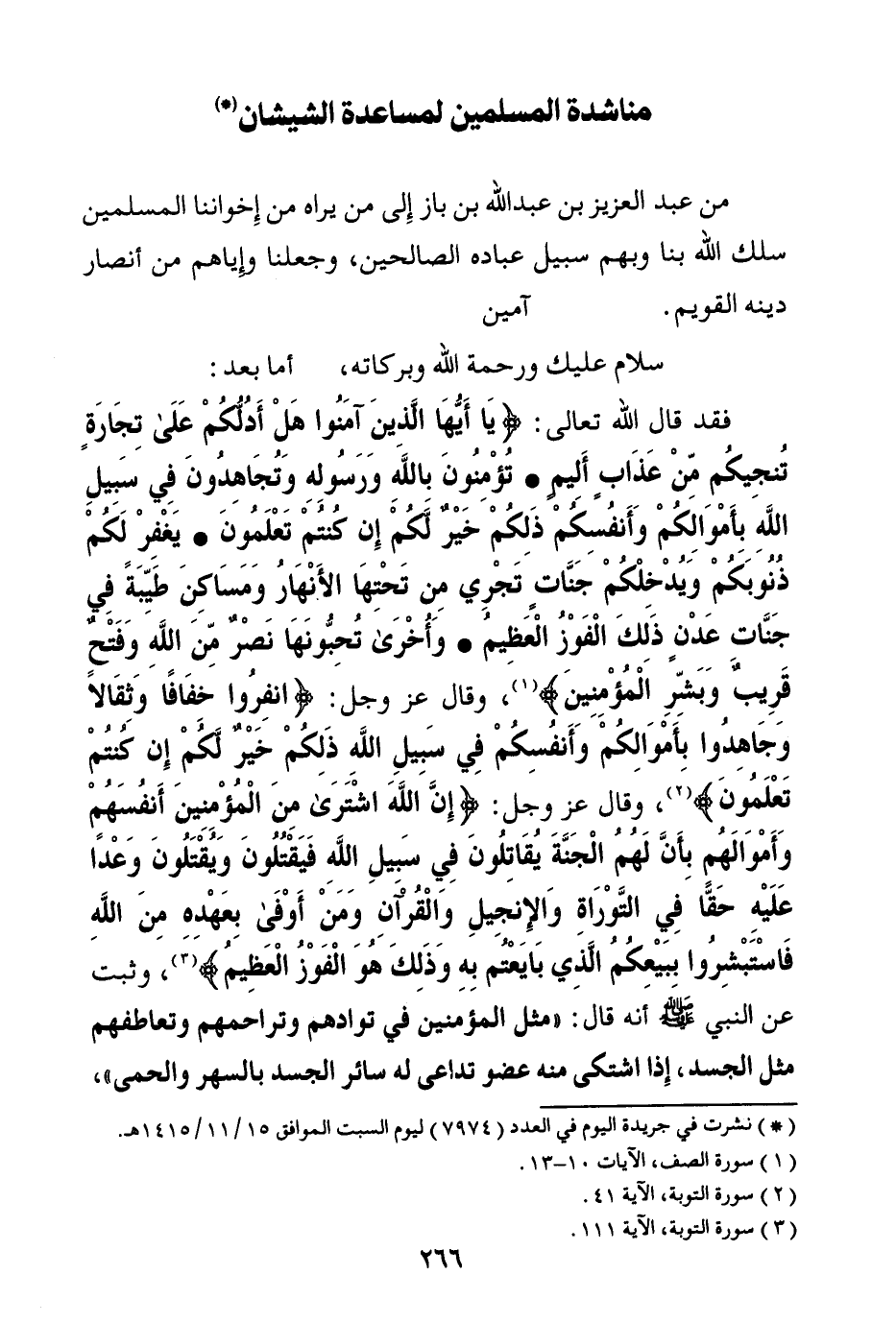 من عبد العزيز بن عبد الله بن باز إلى من يراه من إخواننا المسلمين، سلك الله بنا وبهم سبيل عباده الصالحين، وجعلنا وإياهم من أنصار دينه القويم. آمين