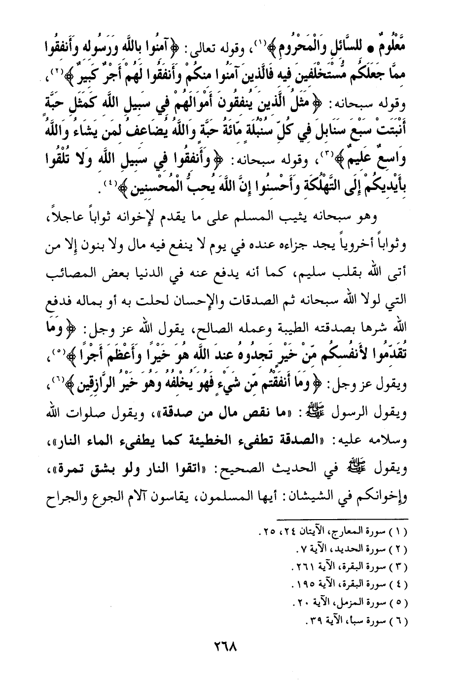 {وَالَّذِينَ فِي أَمْوَالِهِمْ حَقٌّ مَعْلُومٌ} (¬1) {لِلسَّائِلِ وَالْمَحْرُومِ} (¬2) وقوله تعالى: {آمِنُوا بِاللَّهِ وَرَسُولِهِ وَأَنْفِقُوا مِمَّا جَعَلَكُمْ مُسْتَخْلَفِينَ فِيهِ فَالَّذِينَ آمَنُوا مِنْكُمْ وَأَنْفَقُوا لَهُمْ أَجْرٌ كَبِيرٌ} (¬3) وقوله سبحانه: {مَثَلُ الَّذِينَ يُنْفِقُونَ أَمْوَالَهُمْ فِي سَبِيلِ اللَّهِ كَمَثَلِ حَبَّةٍ أَنْبَتَتْ سَبْعَ سَنَابِلَ فِي كُلِّ سُنْبُلَةٍ مِائَةُ حَبَّةٍ وَاللَّهُ يُضَاعِفُ لِمَنْ يَشَاءُ وَاللَّهُ وَاسِعٌ عَلِيمٌ} (¬4) وقوله سبحانه: {وَأَنْفِقُوا فِي سَبِيلِ اللَّهِ وَلَا تُلْقُوا بِأَيْدِيكُمْ إِلَى التَّهْلُكَةِ وَأَحْسِنُوا إِنَّ اللَّهَ يُحِبُّ الْمُحْسِنِينَ} (¬5)