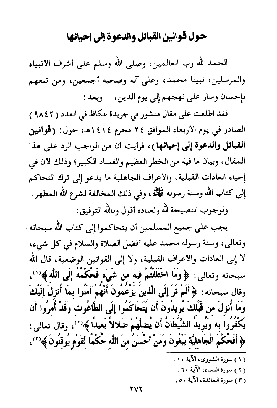 يجب على جميع المسلمين أن يتحاكموا إلى كتاب الله سبحانه وتعالى، وسنة رسوله محمد عليه أفضل الصلاة والسلام في كل شيء، لا إلى العادات والأعراف القبلية، ولا إلى القوانين الوضعية، قال الله سبحانه وتعالى: {وَمَا اخْتَلَفْتُمْ فِيهِ مِنْ شَيْءٍ فَحُكْمُهُ إِلَى اللَّهِ} (¬1) وقال سبحانه: {أَلَمْ تَرَ إِلَى الَّذِينَ يَزْعُمُونَ أَنَّهُمْ آمَنُوا بِمَا أُنْزِلَ إِلَيْكَ وَمَا أُنْزِلَ مِنْ قَبْلِكَ يُرِيدُونَ أَنْ يَتَحَاكَمُوا إِلَى الطَّاغُوتِ وَقَدْ أُمِرُوا أَنْ يَكْفُرُوا بِهِ وَيُرِيدُ الشَّيْطَانُ أَنْ يُضِلَّهُمْ ضَلَالًا بَعِيدًا} (¬2) وقال تعالى: {أَفَحُكْمَ الْجَاهِلِيَّةِ يَبْغُونَ وَمَنْ أَحْسَنُ مِنَ اللَّهِ حُكْمًا لِقَوْمٍ يُوقِنُونَ} (¬3)