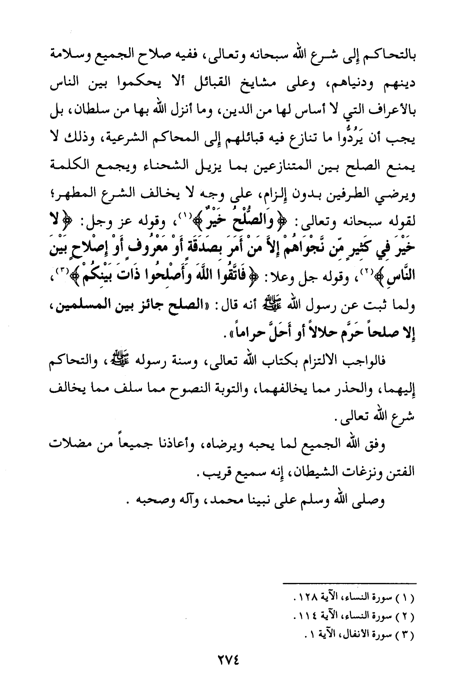 بالتحاكم إلى شرع الله سبحانه وتعالى، ففيه صلاح الجميع وسلامة دينهم ودنياهم، وعلى مشايخ القبائل ألا يحكموا بين الناس بالأعراف التي لا أساس لها من الدين، وما أنزل الله بها من سلطان، بل يجب أن يردوا ما تنازع فيه قبائلهم إلى المحاكم الشرعية، وذلك لا يمنع الصلح بين المتنازعين بما يزيل الشحناء ويجمع الكلمة ويرضي الطرفين بدون إلزام على وجه لا يخالف الشرع المطهر؛ لقوله سبحانه وتعالى: {وَالصُّلْحُ خَيْرٌ} (¬1) وقوله عز وجل: {لَا خَيْرَ فِي كَثِيرٍ مِنْ نَجْوَاهُمْ إِلَّا مَنْ أَمَرَ بِصَدَقَةٍ أَوْ مَعْرُوفٍ أَوْ إِصْلَاحٍ بَيْنَ النَّاسِ} (¬2) وقوله جل وعلا: {فَاتَّقُوا اللَّهَ وَأَصْلِحُوا ذَاتَ بَيْنِكُمْ} (¬3) ولما ثبت عن رسول الله صلى الله عليه وسلم أنه قال: «الصلح جائز بين المسلمين إلا صلحا حرم حلالا أو أحل حراما (¬4) » .