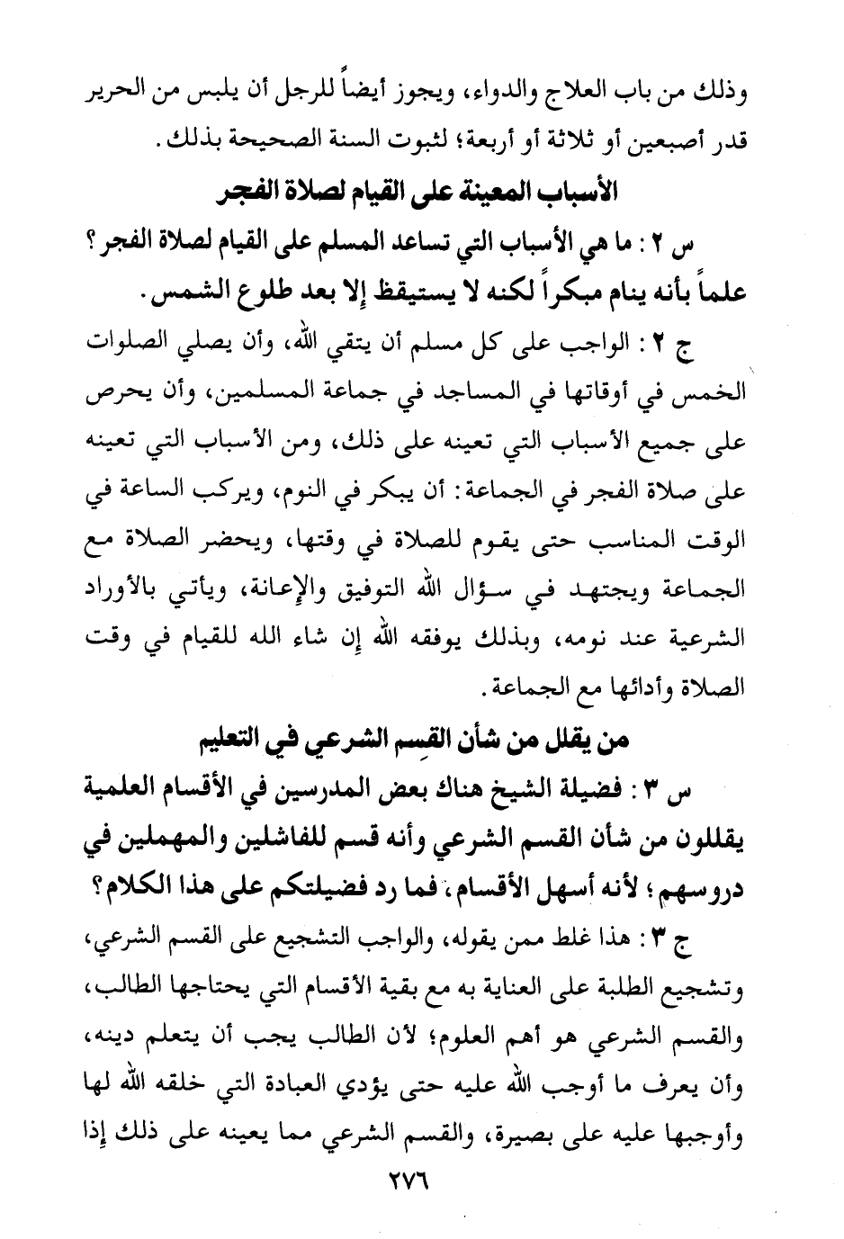 ج3: هذا غلط ممن يقوله، والواجب التشجيع على القسم الشرعي، وتشجيع الطلبة على العناية به مع بقية الأقسام التي يحتاجها الطالب، والقسم الشرعي هو أهم العلوم؛ لأن الطالب يجب أن يتعلم دينه، وأن يعرف ما أوجب الله عليه حتى يؤدي العبادة التي خلقه الله لها وأوجبها عليه على بصيرة، والقسم الشرعي مما يعينه على ذلك إذا