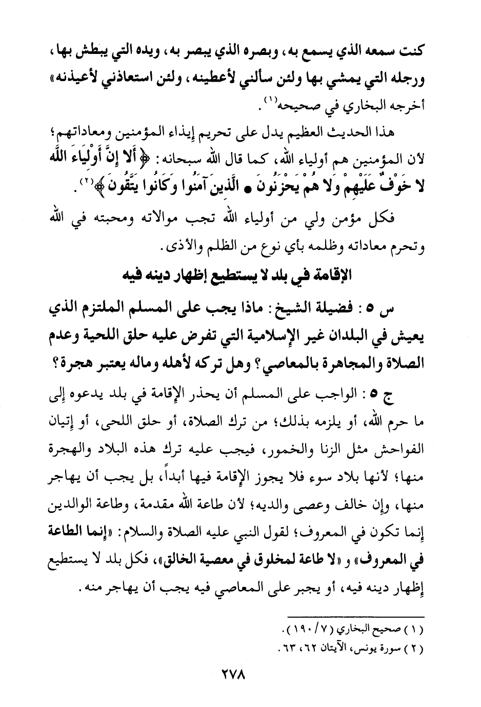ج5: الواجب على المسلم أن يحذر الإقامة في بلد يدعوه إلى ما حرم الله، أو يلزمه بذلك؛ من ترك الصلاة، أو حلق اللحى، أو إتيان الفواحش مثل الزنا والخمور، فيجب عليه ترك هذه البلاد والهجرة منها؛ لأنها بلاد سوء فلا يجوز الإقامة فيها أبدا، بل يجب أن يهاجر منها، وإن خالف وعصى والديه؛ لأن طاعة الله مقدمة، وطاعة الوالدين إنما تكون في المعروف؛ لقول النبي عليه الصلاة والسلام: «إنما الطاعة في المعروف (¬1) » ، و: «لا طاعة لمخلوق في معصية الخالق (¬2) » ، فكل بلد لا يستطيع إظهار دينه فيه، أو يجبر على المعاصي فيه يجب أن يهاجر منه.