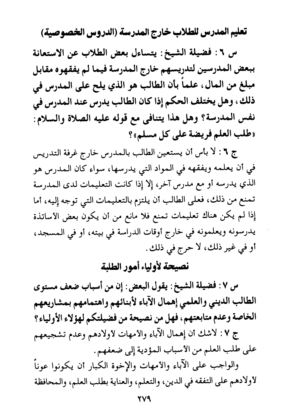 س6: فضيلة الشيخ: يتساءل بعض الطلاب عن الاستعانة ببعض المدرسين؛ لتدريسهم خارج المدرسة فيما لم يفقهوه مقابل مبلغ من المال، علما بأن الطالب هو الذي يلح على المدرس في ذلك، وهل يختلف الحكم إذا كان الطالب يدرس عند المدرس في نفس المدرسة؟ وهل هذا يتنافى مع قوله عليه الصلاة والسلام: «طلب العلم فريضة على كل مسلم (¬1) » ؟