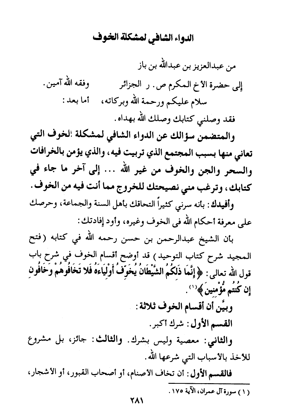 بأن الشيخ عبد الرحمن بن حسن رحمه الله في كتابه (فتح المجيد شرح كتاب التوحيد) قد أوضح أقسام الخوف في شرح باب قول الله تعالى: {إِنَّمَا ذَلِكُمُ الشَّيْطَانُ يُخَوِّفُ أَوْلِيَاءَهُ فَلَا تَخَافُوهُمْ وَخَافُونِ إِنْ كُنْتُمْ مُؤْمِنِينَ} (¬1)
