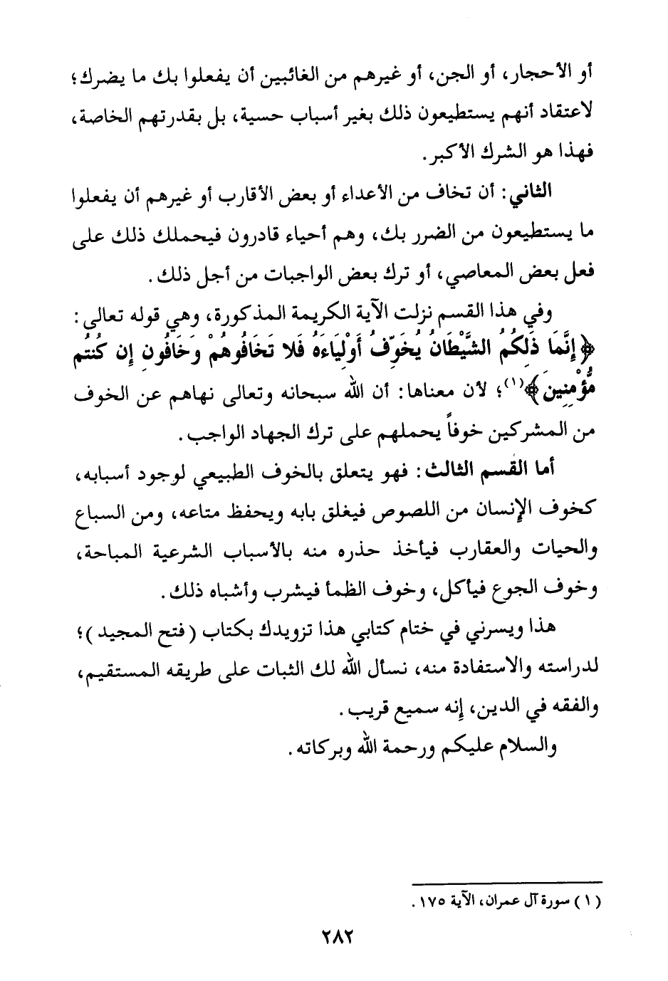 أما القسم الثالث: فهو يتعلق بالخوف الطبيعي لوجود أسبابه، كخوف الإنسان من اللصوص فيغلق بابه ويحفظ متاعه، ومن السباع والحيات والعقارب فيأخذ حذره منه بالأسباب الشرعية المباحة، وخوف الجوع فيأكل، وخوف الظمأ فيشرب وأشباه ذلك. هذا ويسرني في ختام كتابي هذا تزويدك بكتاب (فتح المجيد) ؛ لدراسته والاستفادة منه، نسأل الله لك الثبات على طريقه المستقيم، والفقه في الدين، إنه سميع قريب.