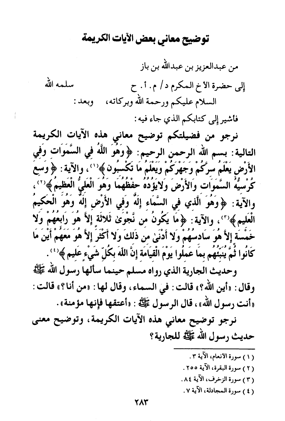 وحديث الجارية الذي رواه مسلم، حينما سألها رسول الله صلى الله عليه وسلم وقال: «أين الله؟ قالت: في السماء. وقال لها: من أنا؟ قالت: أنت رسول الله. قال الرسول صلى الله عليه وسلم: أعتقها؛ فإنها مؤمنة (¬5) » .