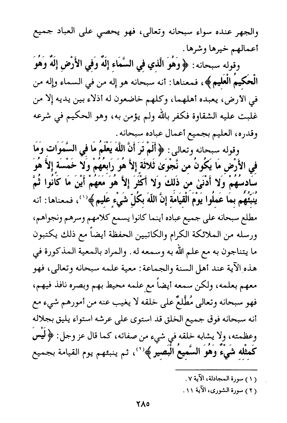وقوله سبحانه وتعالى: {أَلَمْ تَرَ أَنَّ اللَّهَ يَعْلَمُ مَا فِي السَّمَاوَاتِ وَمَا فِي الْأَرْضِ مَا يَكُونُ مِنْ نَجْوَى ثَلَاثَةٍ إِلَّا هُوَ رَابِعُهُمْ وَلَا خَمْسَةٍ إِلَّا هُوَ سَادِسُهُمْ وَلَا أَدْنَى مِنْ ذَلِكَ وَلَا أَكْثَرَ إِلَّا هُوَ مَعَهُمْ أَيْنَ مَا كَانُوا ثُمَّ يُنَبِّئُهُمْ بِمَا عَمِلُوا يَوْمَ الْقِيَامَةِ إِنَّ اللَّهَ بِكُلِّ شَيْءٍ عَلِيمٌ} (¬2) فمعناها: أنه مطلع سبحانه على جميع عباده، أينما كانوا يسمع كلامهم وسرهم ونجواهم، ورسله من الملائكة الكرام والكاتبين الحفظة أيضا مع ذلك يكتبون ما يتناجون به مع علم الله به وسمعه له.
