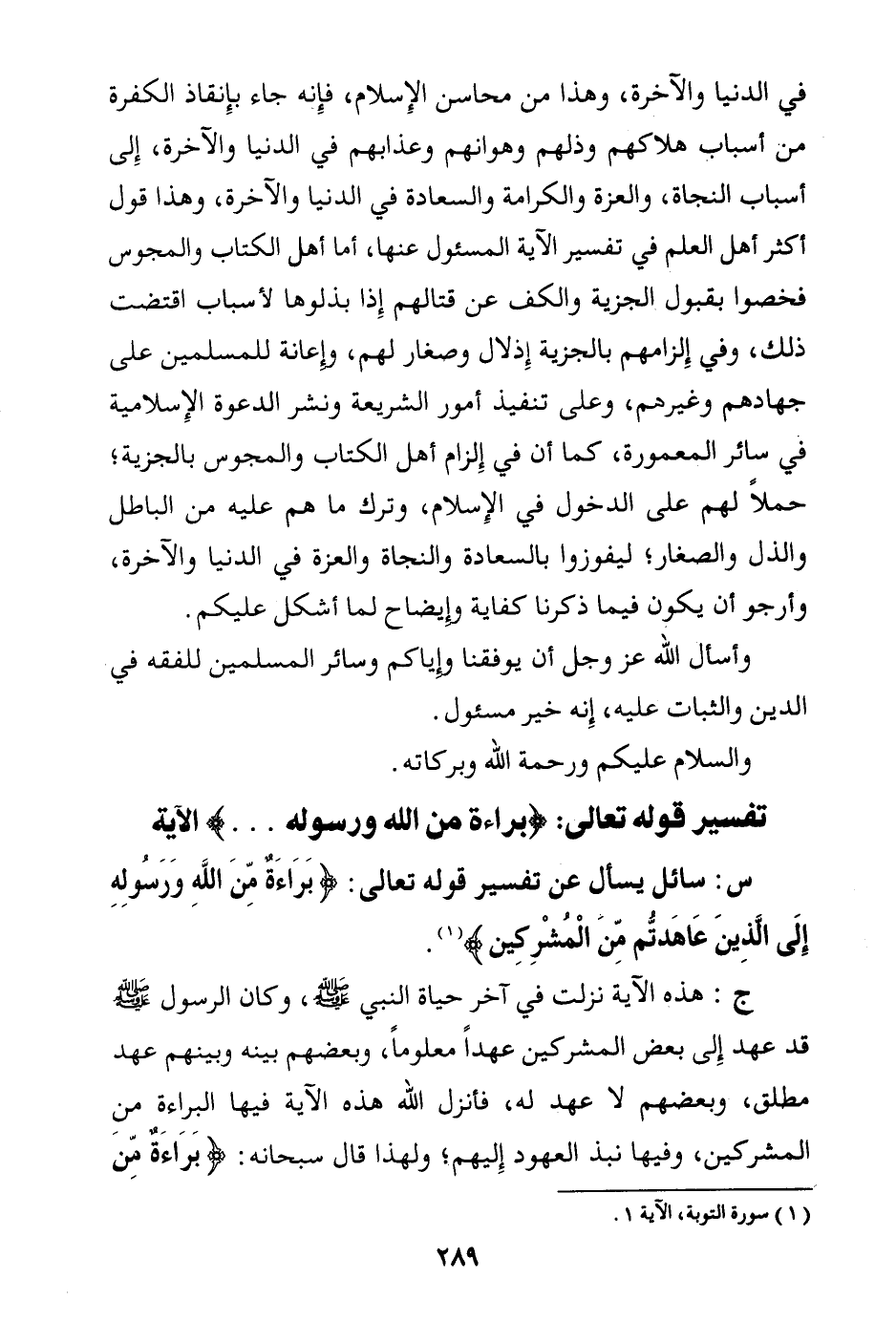 س: سائل يسأل عن تفسير قوله تعالى: {بَرَاءَةٌ مِنَ اللَّهِ وَرَسُولِهِ إِلَى الَّذِينَ عَاهَدْتُمْ مِنَ الْمُشْرِكِينَ} (¬2)