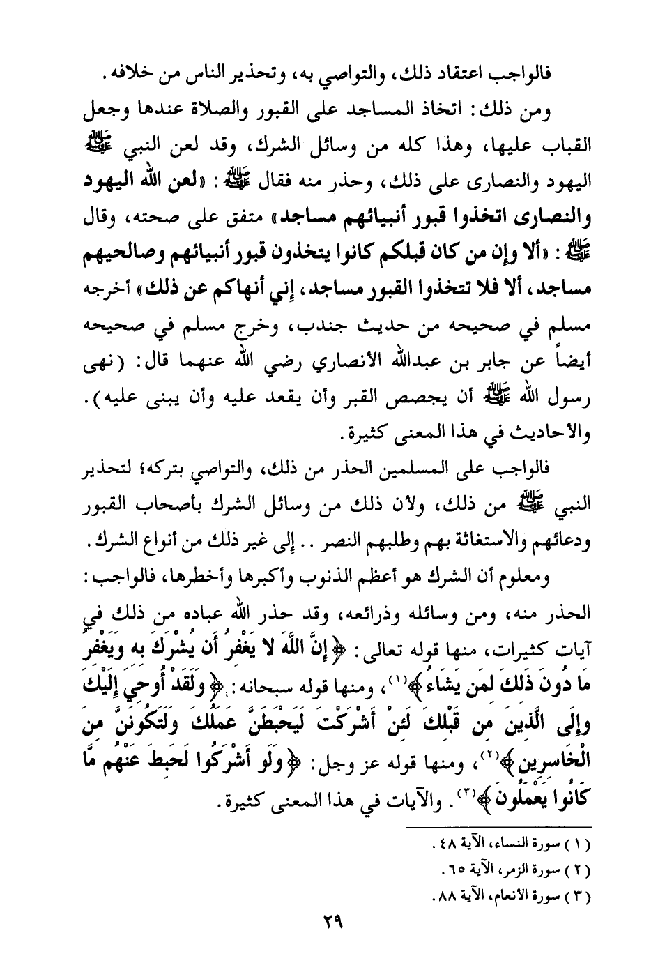 ومن ذلك: اتخاذ المساجد على القبور والصلاة عندها وجعل القباب عليها، وهذا كله من وسائل الشرك، وقد لعن النبي صلى الله عليه وسلم اليهود والنصارى على ذلك، وحذر منه فقال صلى الله عليه وسلم: «لعن الله اليهود والنصارى اتخذوا قبور أنبيائهم مساجد (¬1) » متفق على صحته، وقال صلى الله عليه وسلم: «ألا وإن من كان قبلكم كانوا يتخذون قبور أنبيائهم وصالحيهم مساجد، ألا فلا تتخذوا القبور مساجد؛ إني أنهاكم عن ذلك (¬2) » أخرجه مسلم في صحيحه من حديث جندب، وخرج مسلم في صحيحه أيضا عن جابر بن عبد الله الأنصاري رضي الله عنهما قال: «نهى رسول الله صلى الله عليه وسلم أن يجصص القبر وأن يقعد عليه وأن يبنى عليه (¬3) » . والأحاديث في هذا المعنى كثيرة.