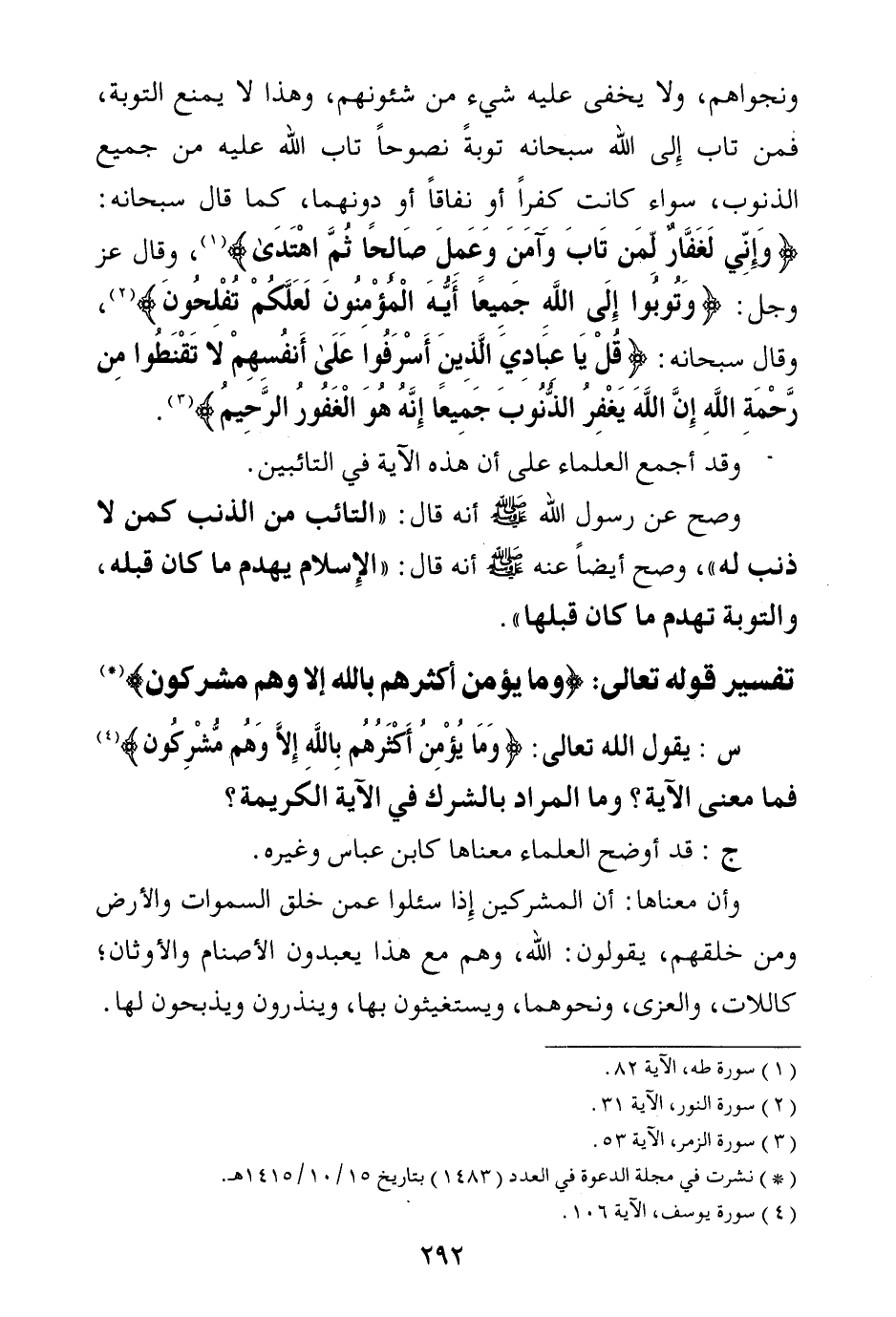 س: يقول الله تعالى: {وَمَا يُؤْمِنُ أَكْثَرُهُمْ بِاللَّهِ إِلَّا وَهُمْ مُشْرِكُونَ} (¬3) فما معنى الآية؟ وما المراد بالشرك في الآية الكريمة؟