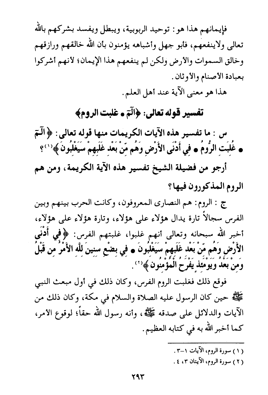 ج: الروم: هم النصارى المعروفون، وكانت الحرب بينهم وبين الفرس سجالا تارة يدال هؤلاء على هؤلاء، وتارة هؤلاء على هؤلاء، أخبر الله سبحانه وتعالى أنهم غلبوا، غلبتهم الفرس: {فِي أَدْنَى الْأَرْضِ وَهُمْ مِنْ بَعْدِ غَلَبِهِمْ سَيَغْلِبُونَ} (¬6) {فِي بِضْعِ سِنِينَ لِلَّهِ الْأَمْرُ مِنْ قَبْلُ وَمِنْ بَعْدُ وَيَوْمَئِذٍ يَفْرَحُ الْمُؤْمِنُونَ} (¬7)