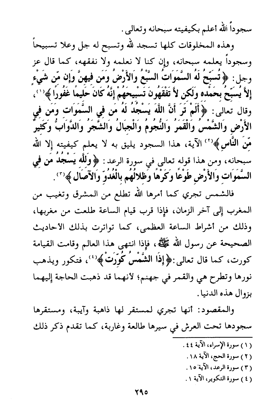 وهذه المخلوقات كلها تسجد لله وتسبح له جل وعلا تسبيحا وسجودا يعلمه سبحانه، وإن كنا لا نعلمه ولا نفقهه، كما قال عز وجل: {تُسَبِّحُ لَهُ السَّمَاوَاتُ السَّبْعُ وَالْأَرْضُ وَمَنْ فِيهِنَّ وَإِنْ مِنْ شَيْءٍ إِلَّا يُسَبِّحُ بِحَمْدِهِ وَلَكِنْ لَا تَفْقَهُونَ تَسْبِيحَهُمْ إِنَّهُ كَانَ حَلِيمًا غَفُورًا} (¬1) وقال تعالى: {أَلَمْ تَرَ أَنَّ اللَّهَ يَسْجُدُ لَهُ مَنْ فِي السَّمَاوَاتِ وَمَنْ فِي الْأَرْضِ وَالشَّمْسُ وَالْقَمَرُ وَالنُّجُومُ وَالْجِبَالُ وَالشَّجَرُ وَالدَّوَابُّ وَكَثِيرٌ مِنَ النَّاسِ} (¬2) الآية، هذا السجود يليق به لا يعلم كيفيته إلا الله سبحانه، ومن هذا قوله تعالى في سورة الرعد: {وَلِلَّهِ يَسْجُدُ مَنْ فِي السَّمَاوَاتِ وَالْأَرْضِ طَوْعًا وَكَرْهًا وَظِلَالُهُمْ بِالْغُدُوِّ وَالْآصَالِ} (¬3)