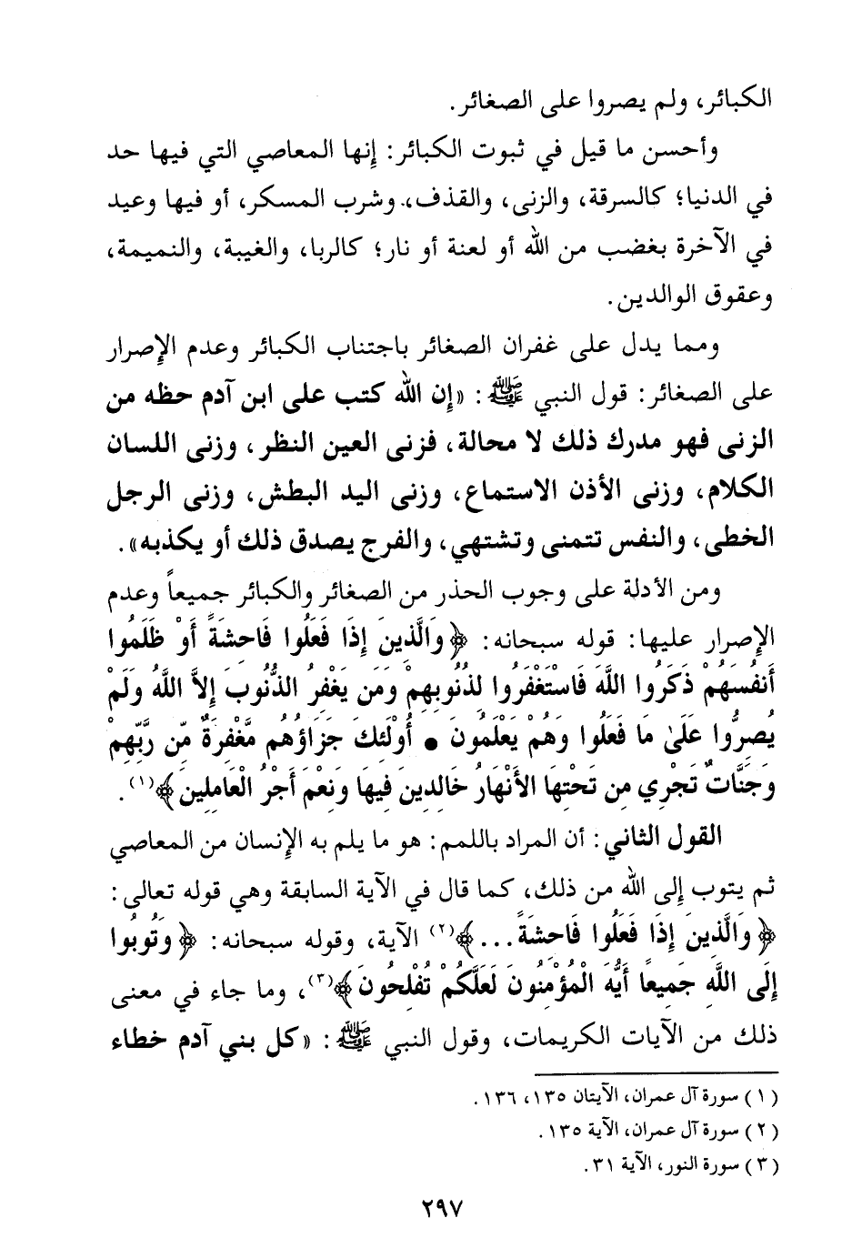 ومما يدل على غفران الصغائر باجتناب الكبائر وعدم الإصرار على الصغائر: قول النبي صلى الله عليه وسلم: «إن الله كتب على ابن آدم حظه من الزنى، فهو مدرك ذلك لا محالة، فزنى العين النظر، وزنى اللسان الكلام، وزنى الأذن الاستماع، وزنى اليد البطش، وزنى الرجل الخطى، والنفس تتمنى وتشتهي، والفرج يصدق ذلك أو يكذبه (¬1) » .
