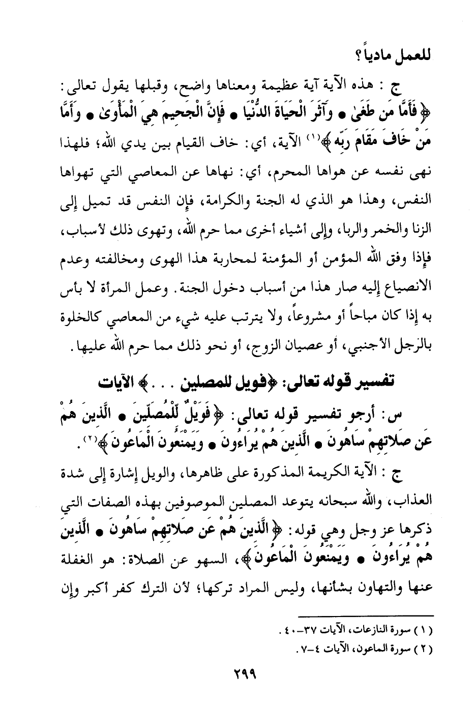 ج: الآية الكريمة المذكورة على ظاهرها، والويل إشارة إلى شدة العذاب، والله سبحانه يتوعد المصلين الموصوفين بهذه الصفات التي ذكرها عز وجل وهي قوله: {الَّذِينَ هُمْ عَنْ صَلَاتِهِمْ سَاهُونَ} (¬6) {الَّذِينَ هُمْ يُرَاءُونَ} (¬7) {وَيَمْنَعُونَ الْمَاعُونَ} (¬8) السهو عن الصلاة: هو الغفلة عنها والتهاون بشأنها، وليس المراد تركها؛ لأن الترك كفر أكبر وإن