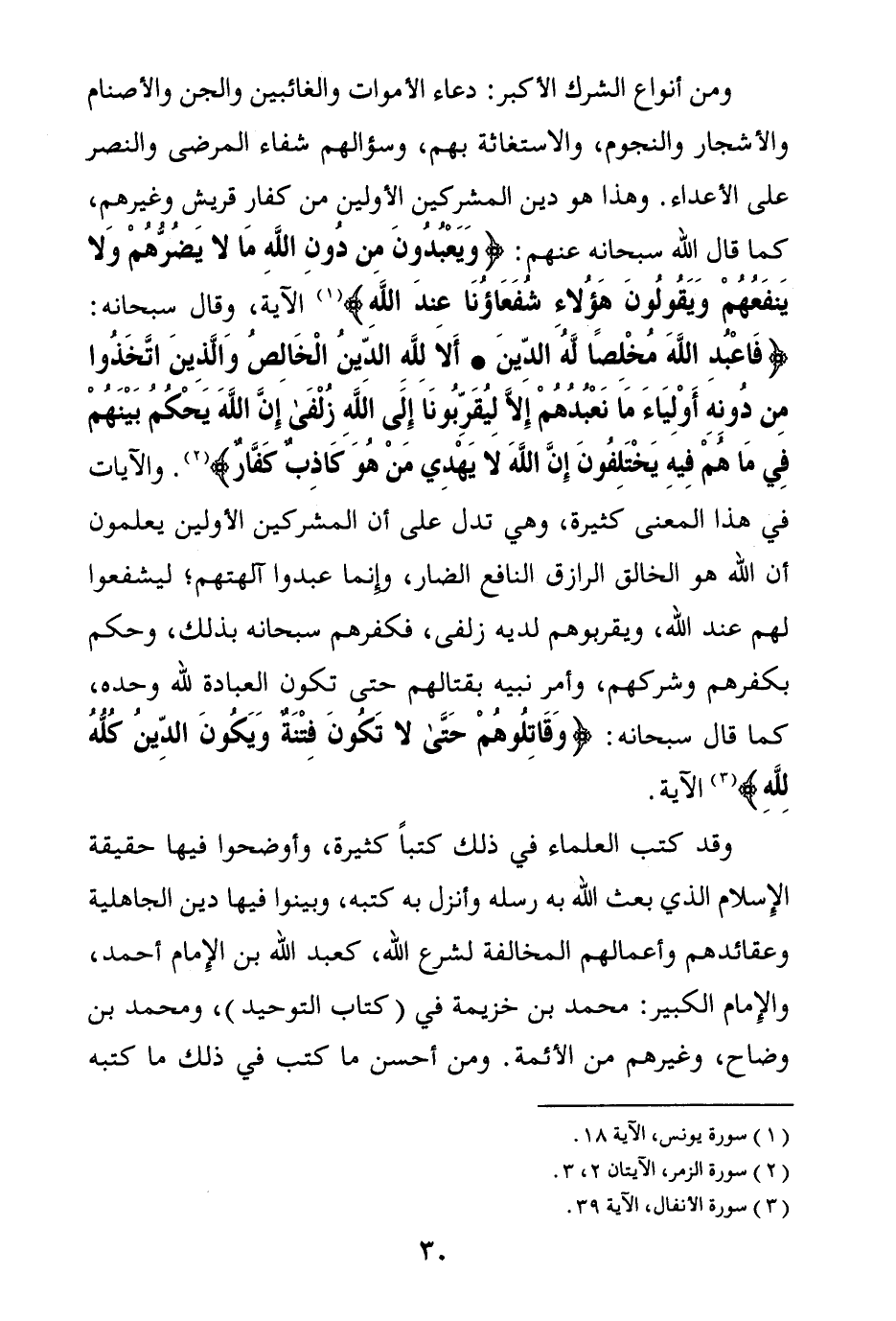 ومن أنواع الشرك الأكبر: دعاء الأموات والغائبين والجن والأصنام والأشجار والنجوم، والاستغاثة بهم، وسؤالهم شفاء المرضى والنصر على الأعداء. وهذا هو دين المشركين الأولين من كفار قريش وغيرهم، كما قال الله سبحانه عنهم: {وَيَعْبُدُونَ مِنْ دُونِ اللَّهِ مَا لَا يَضُرُّهُمْ وَلَا يَنْفَعُهُمْ وَيَقُولُونَ هَؤُلَاءِ شُفَعَاؤُنَا عِنْدَ اللَّهِ} (¬1) الآية، وقال سبحانه: {فَاعْبُدِ اللَّهَ مُخْلِصًا لَهُ الدِّينَ} (¬2) {أَلَا لِلَّهِ الدِّينُ الْخَالِصُ وَالَّذِينَ اتَّخَذُوا مِنْ دُونِهِ أَوْلِيَاءَ مَا نَعْبُدُهُمْ إِلَّا لِيُقَرِّبُونَا إِلَى اللَّهِ زُلْفَى إِنَّ اللَّهَ يَحْكُمُ بَيْنَهُمْ فِي مَا هُمْ فِيهِ يَخْتَلِفُونَ إِنَّ اللَّهَ لَا يَهْدِي مَنْ هُوَ كَاذِبٌ كَفَّارٌ} (¬3)