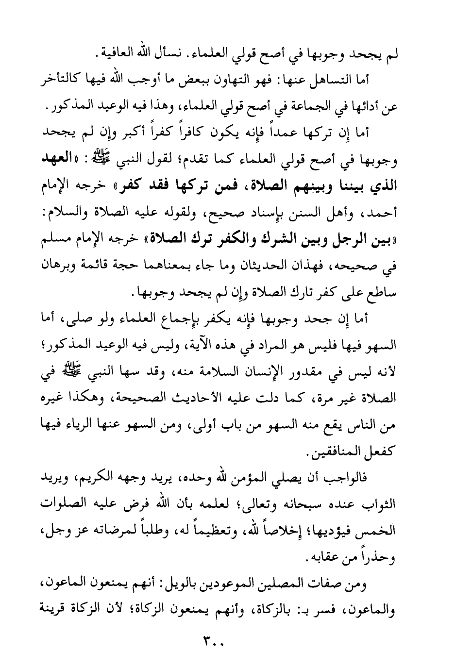 أما إن جحد وجوبها فإنه يكفر بإجماع العلماء ولو صلى، أما السهو فيها فليس هو المراد في هذه الآية، وليس فيه الوعيد المذكور؛ لأنه ليس في مقدور الإنسان السلامة منه، وقد سها النبي صلى الله عليه وسلم في الصلاة غير مرة، كما دلت عليه الأحاديث الصحيحة، وهكذا غيره من الناس يقع منه السهو من باب أولى، ومن السهو عنها الرياء فيها كفعل المنافقين.
