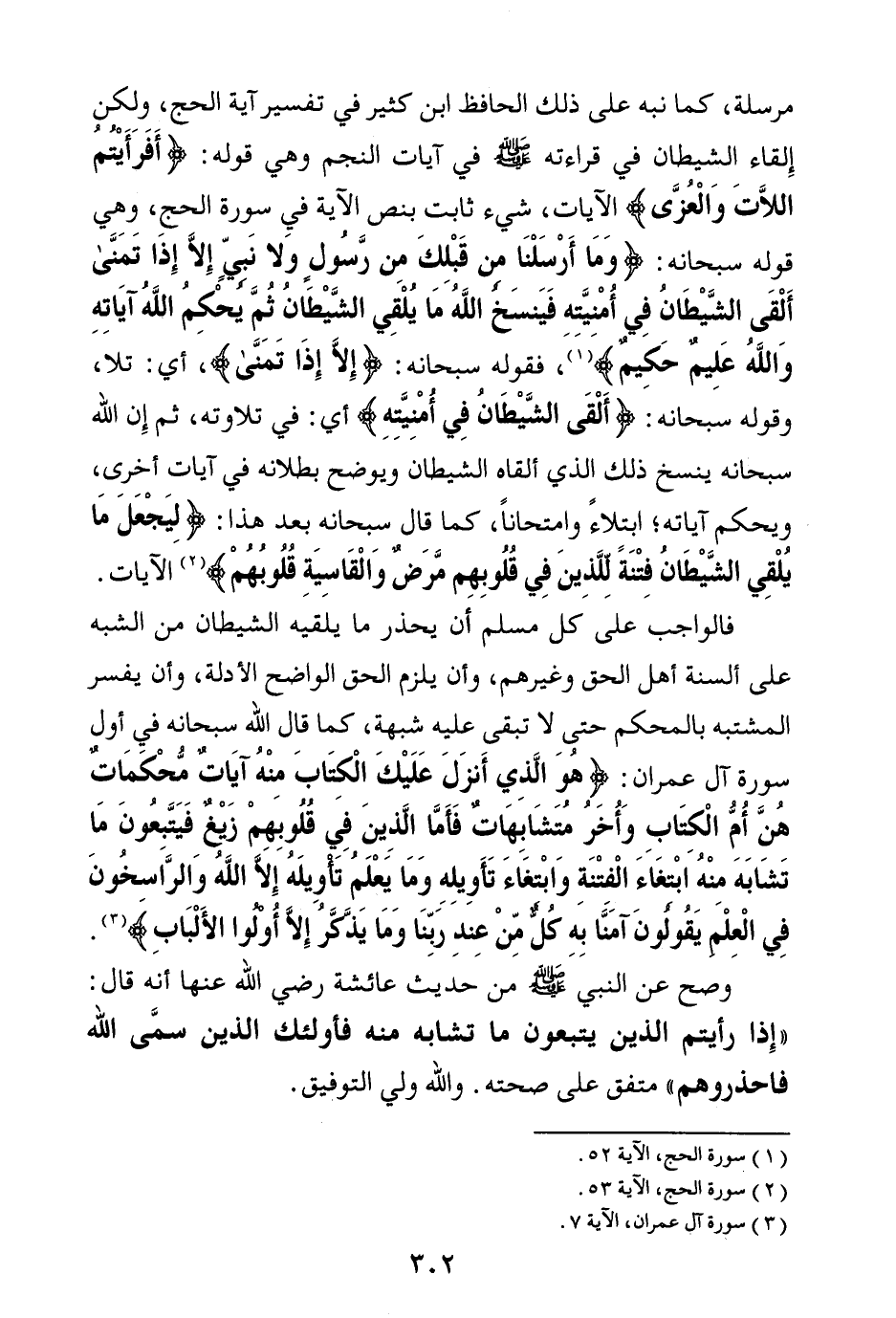فالواجب على كل مسلم أن يحذر ما يلقيه الشيطان من الشبه على ألسنة أهل الحق وغيرهم، وأن يلزم الحق الواضح الأدلة، وأن يفسر المشتبه بالمحكم حتى لا تبقى عليه شبهة، كما قال الله سبحانه في أول سورة آل عمران: {هُوَ الَّذِي أَنْزَلَ عَلَيْكَ الْكِتَابَ مِنْهُ آيَاتٌ مُحْكَمَاتٌ هُنَّ أُمُّ الْكِتَابِ وَأُخَرُ مُتَشَابِهَاتٌ فَأَمَّا الَّذِينَ فِي قُلُوبِهِمْ زَيْغٌ فَيَتَّبِعُونَ مَا تَشَابَهَ مِنْهُ ابْتِغَاءَ الْفِتْنَةِ وَابْتِغَاءَ تَأْوِيلِهِ وَمَا يَعْلَمُ تَأْوِيلَهُ إِلَّا اللَّهُ وَالرَّاسِخُونَ فِي الْعِلْمِ يَقُولُونَ آمَنَّا بِهِ كُلٌّ مِنْ عِنْدِ رَبِّنَا وَمَا يَذَّكَّرُ إِلَّا أُولُو الْأَلْبَابِ} (¬6)