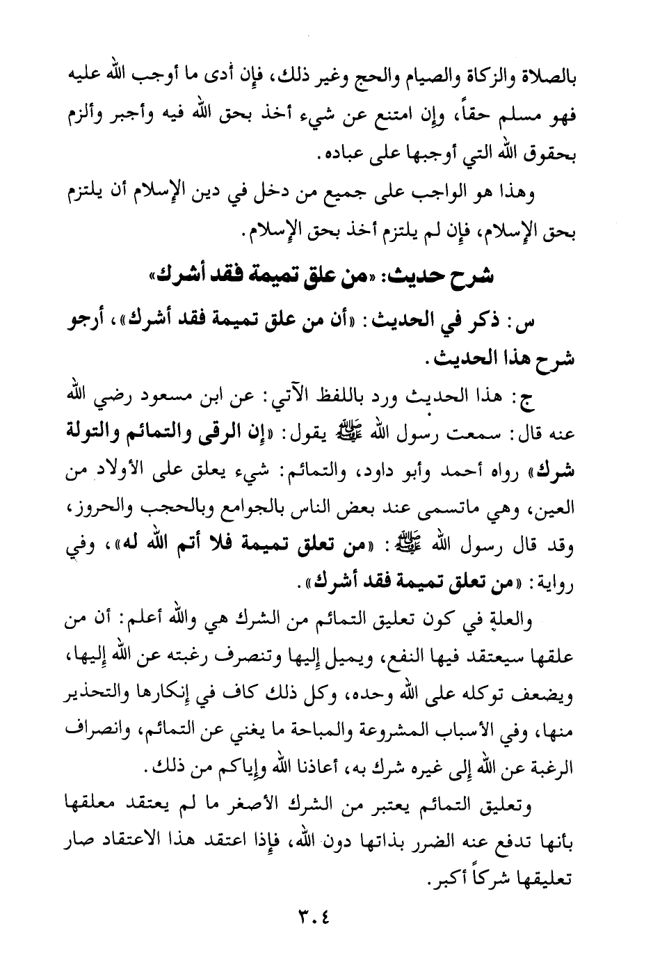 ج: هذا الحديث ورد باللفظ الآتي: عن ابن مسعود رضي الله عنه قال: سمعت رسول الله صلى الله عليه وسلم يقول: «إن الرقى والتمائم والتولة شرك (¬3) » ، رواه أحمد وأبو داود، والتمائم: شيء يعلق على الأولاد من العين، وهي ما تسمى عند بعض الناس بالجوامع وبالحجب والحروز، وقد قال رسول الله صلى الله عليه وسلم: «من تعلق تميمة فلا أتم الله له (¬4) » ، وفي رواية: «من تعلق تميمة فقد أشرك (¬5) » .
