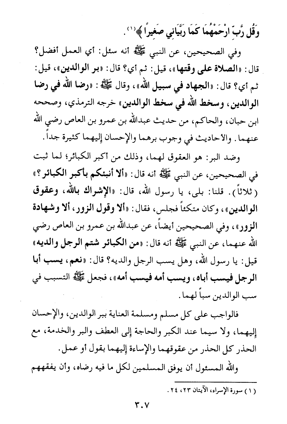 فالواجب على كل مسلم ومسلمة العناية ببر الوالدين، والإحسان إليهما، ولا سيما عند الكبر والحاجة إلى العطف والبر والخدمة، مع الحذر كل الحذر من عقوقهما والإساءة إليهما بقول أو عمل.