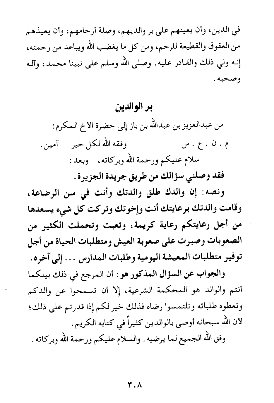 من عبد العزيز بن عبد الله بن باز إلى حضرة الأخ المكرم: